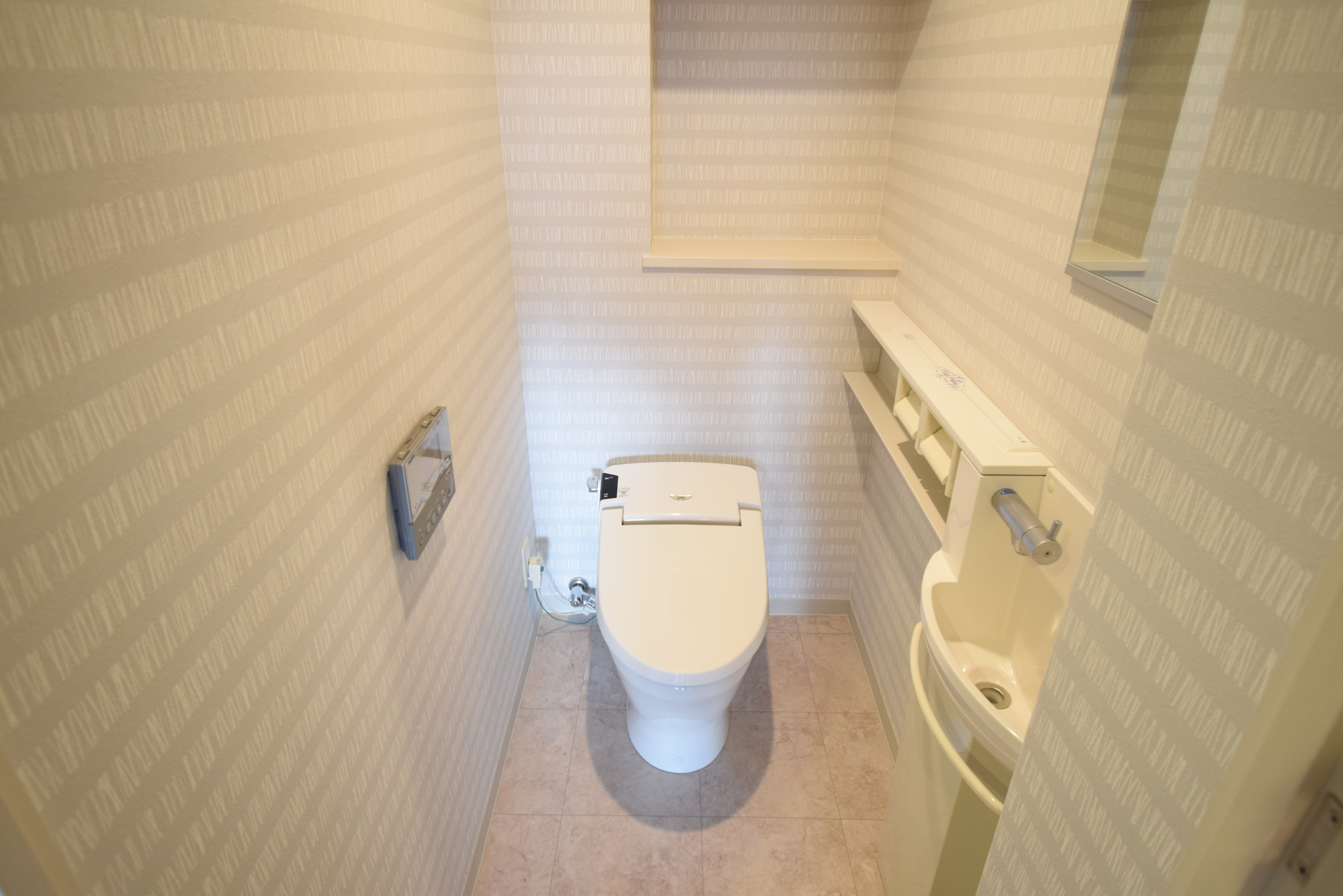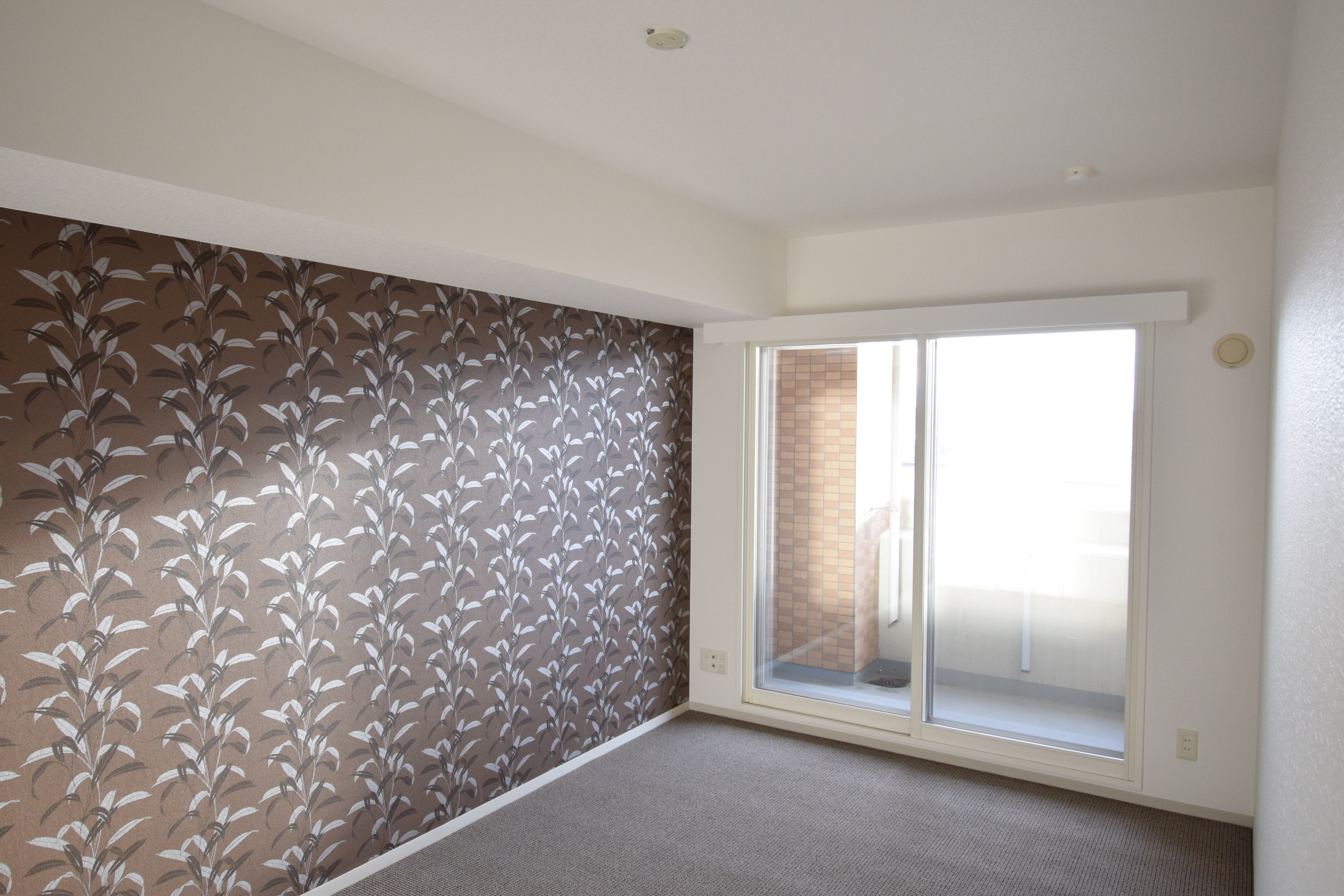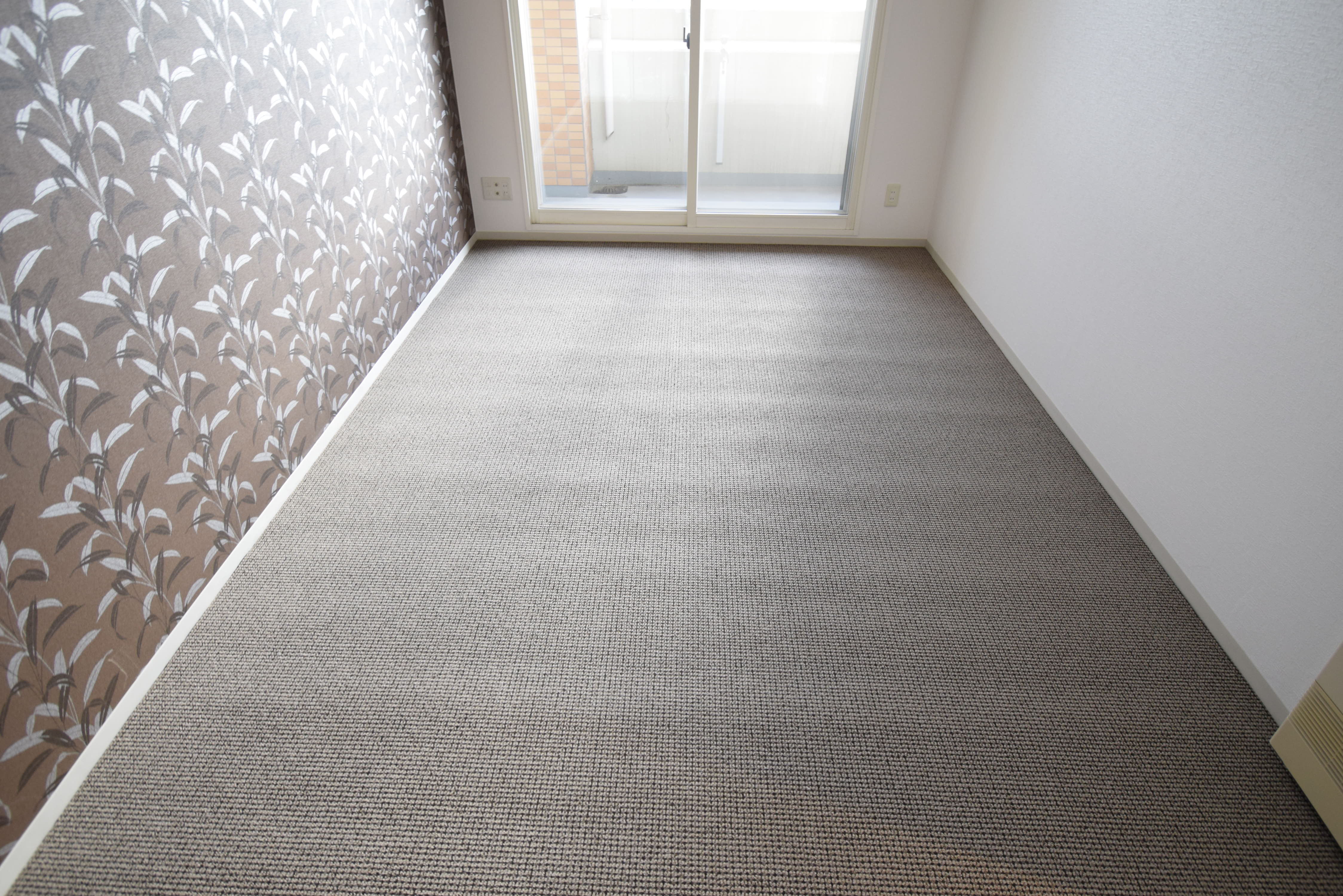 洋室の壁紙はベースを白地、アクセントに少し和風テイストで植物柄の壁紙をあしらいました。フローリングはグレー地のカーペットにすることで色が調和した落ち着いた雰囲気に変わりました。 トイレは無機質だった壁に北欧テイストのライン柄を設け、床には石目柄でベージュ系のクッションフロアを敷くことで温かみのある空間に変わりました。