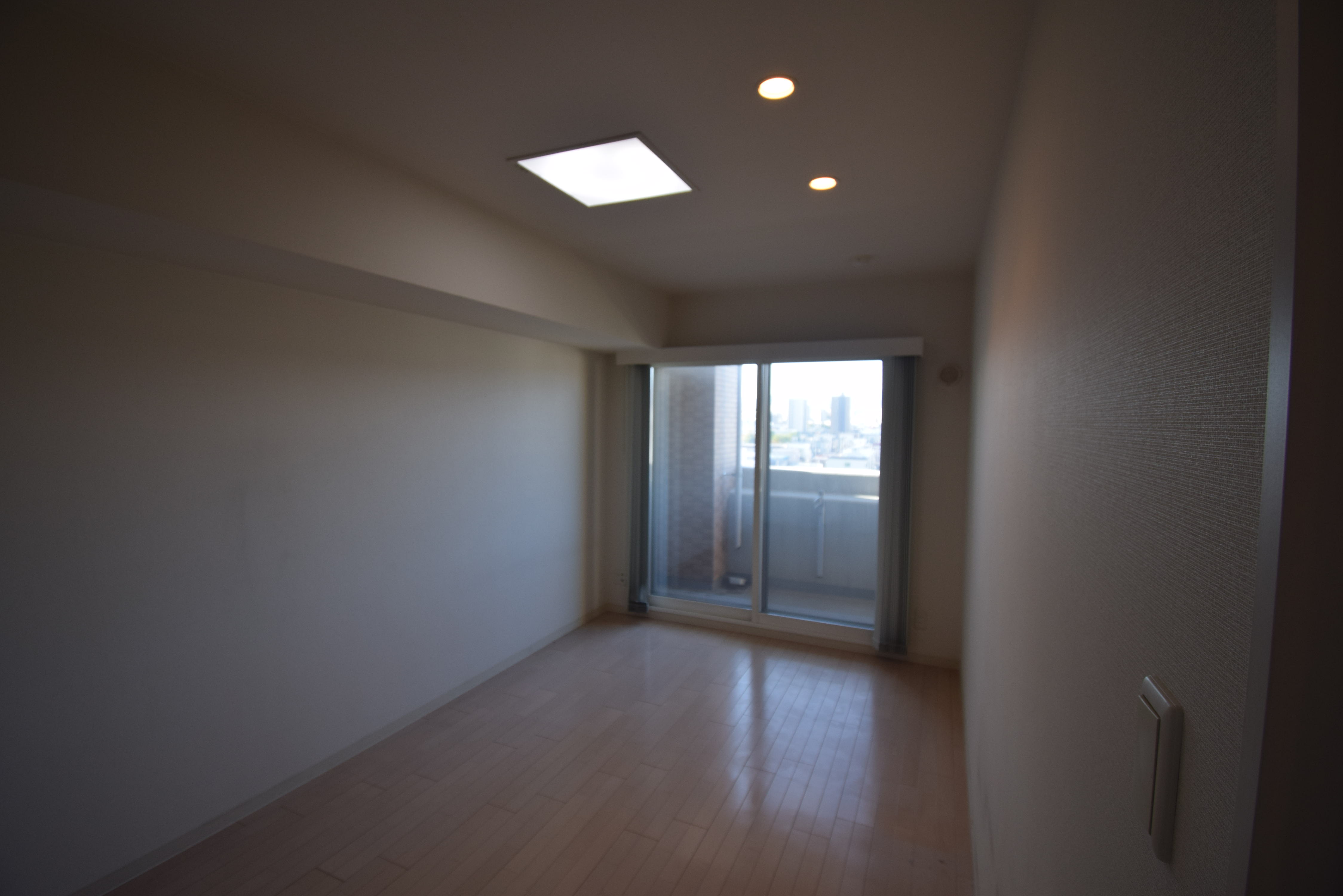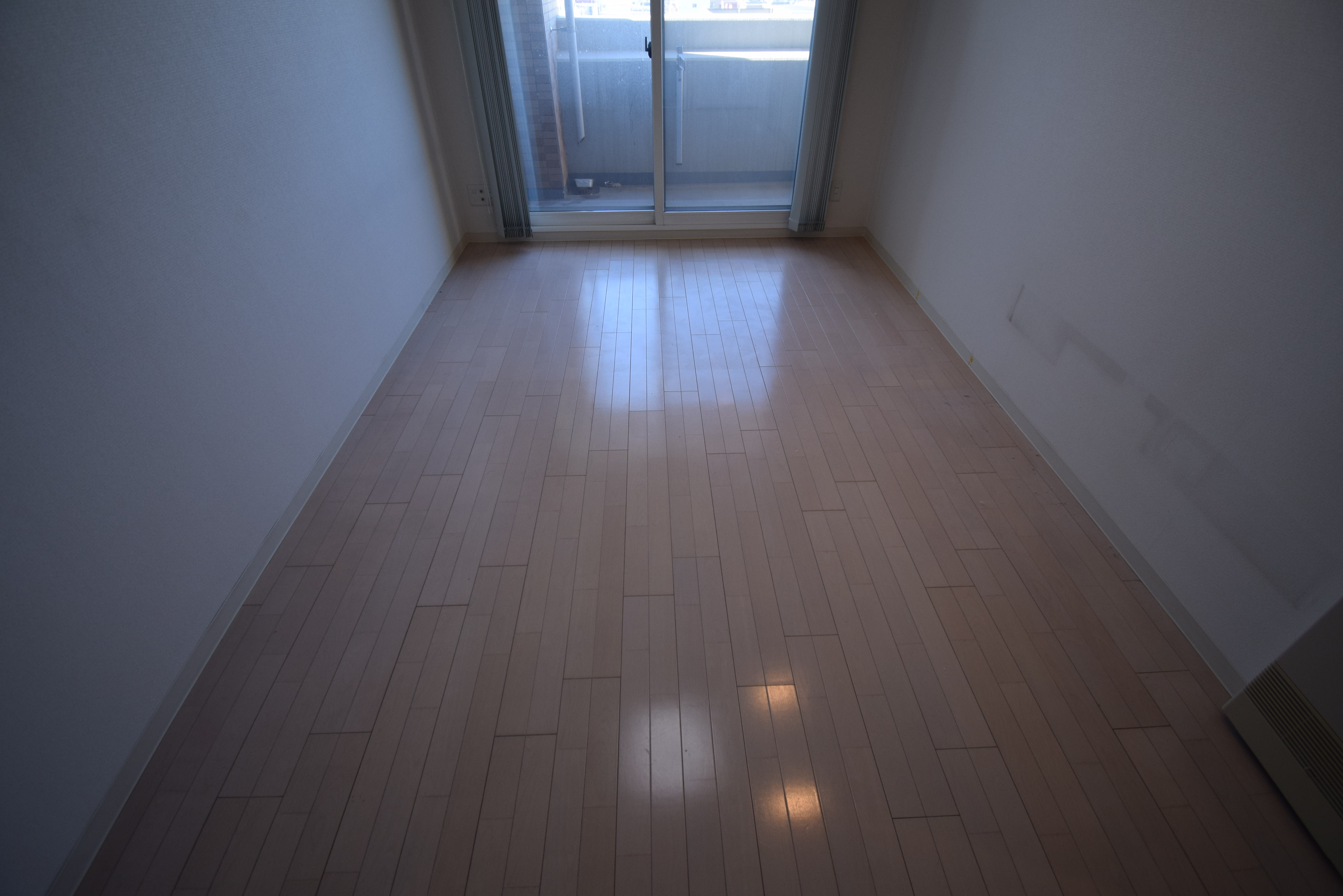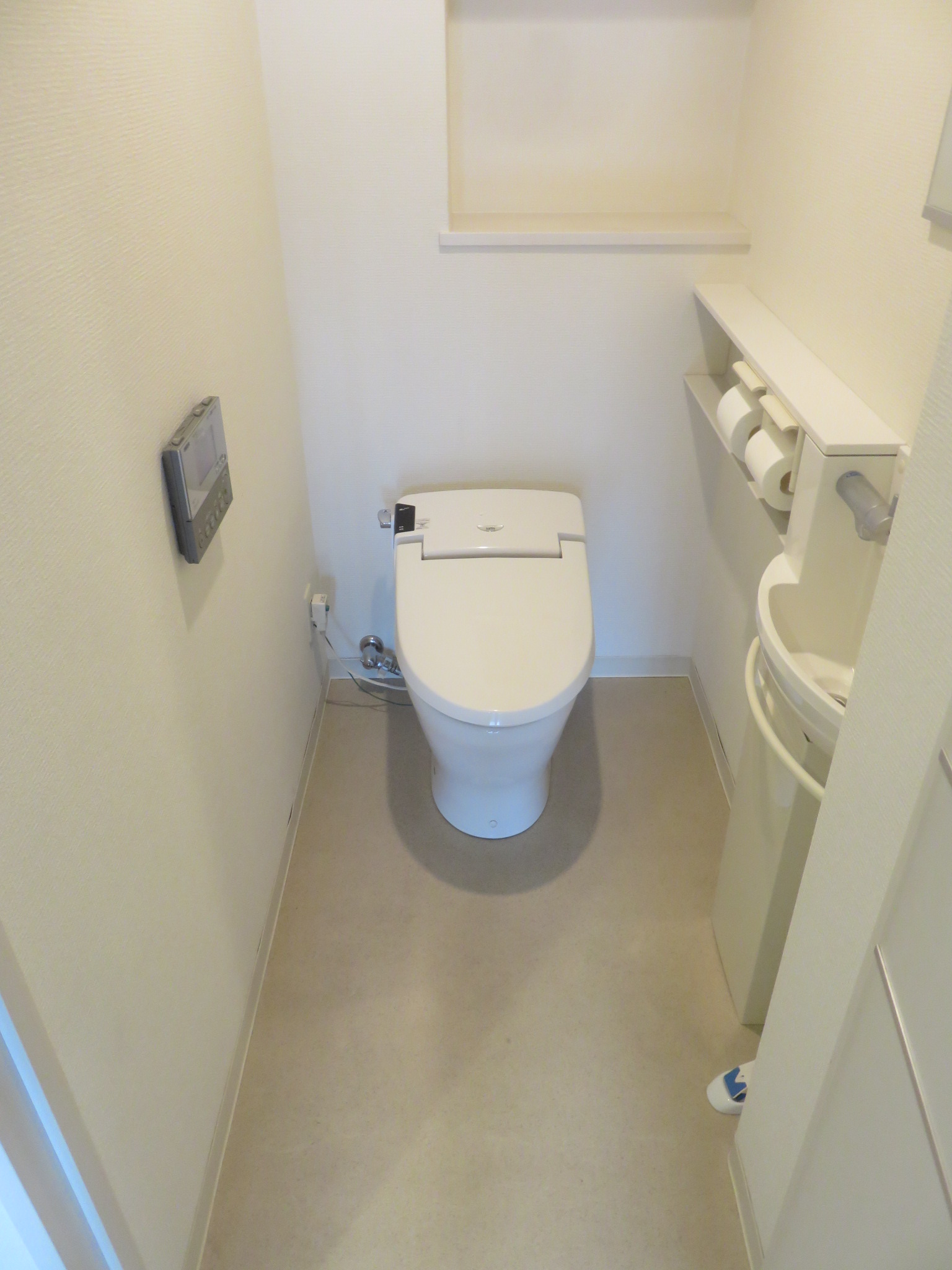 洋室の壁紙はベースを白地、アクセントに少し和風テイストで植物柄の壁紙をあしらいました。フローリングはグレー地のカーペットにすることで色が調和した落ち着いた雰囲気に変わりました。 トイレは無機質だった壁に北欧テイストのライン柄を設け、床には石目柄でベージュ系のクッションフロアを敷くことで温かみのある空間に変わりました。