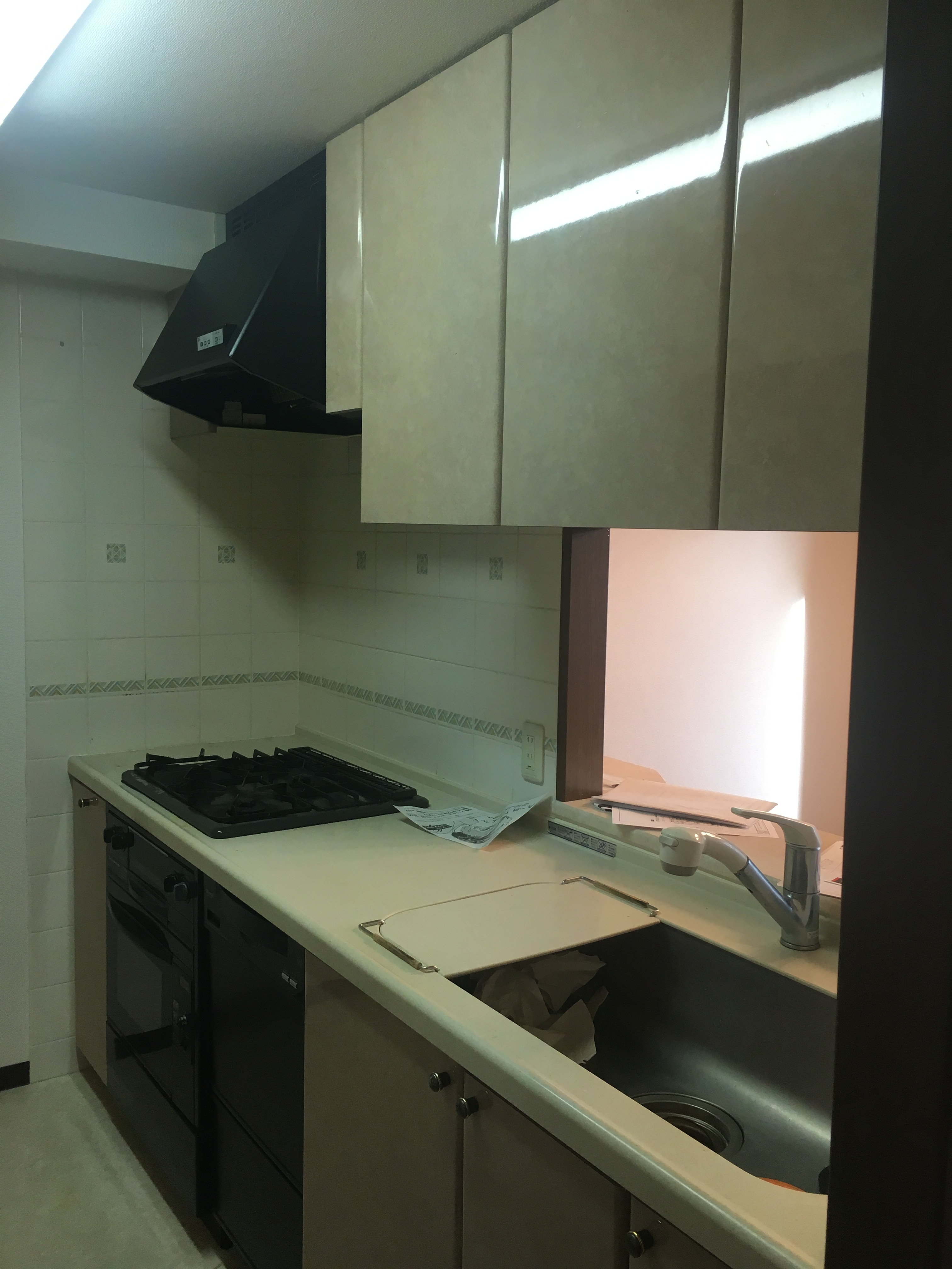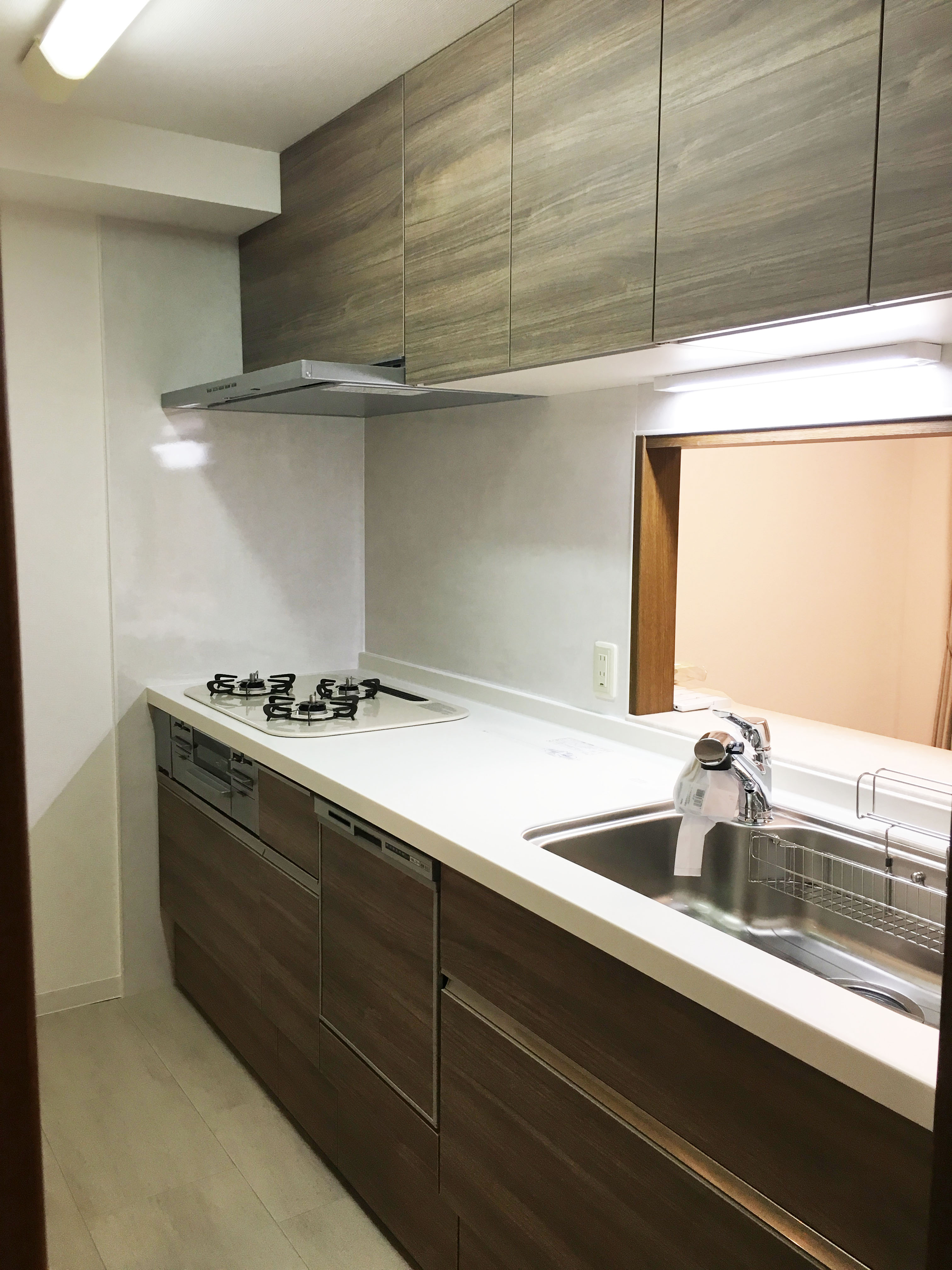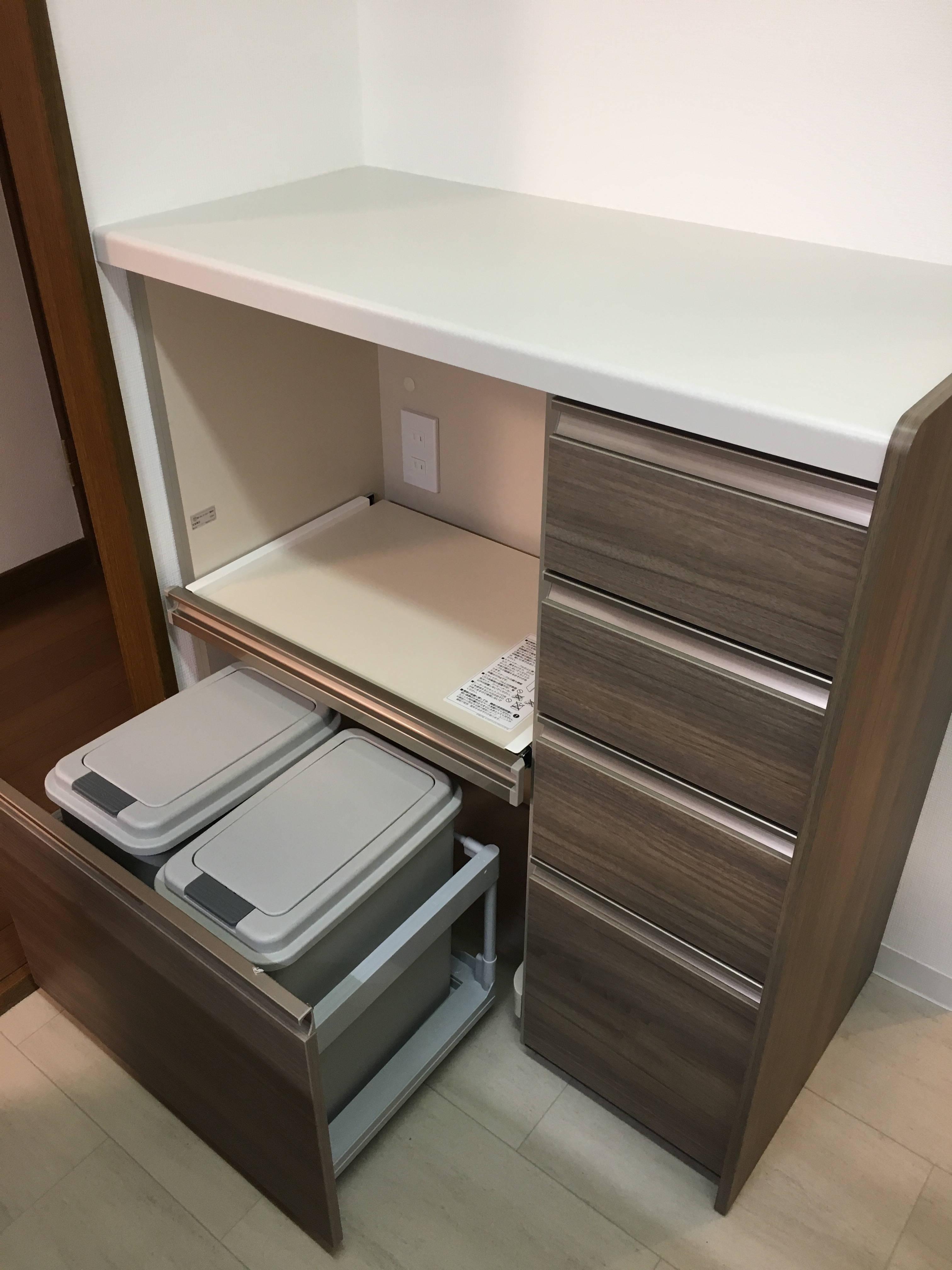 ウォルナットの美しさが引き立つ最新のキッチンと食器棚へ交換しました。奥様のご希望を盛り込んだ使い勝手・清掃性の高い仕様となっております。ダストボックス収納を食器棚に組み込み、限りのあるキッチン空間を有効的に使っております。