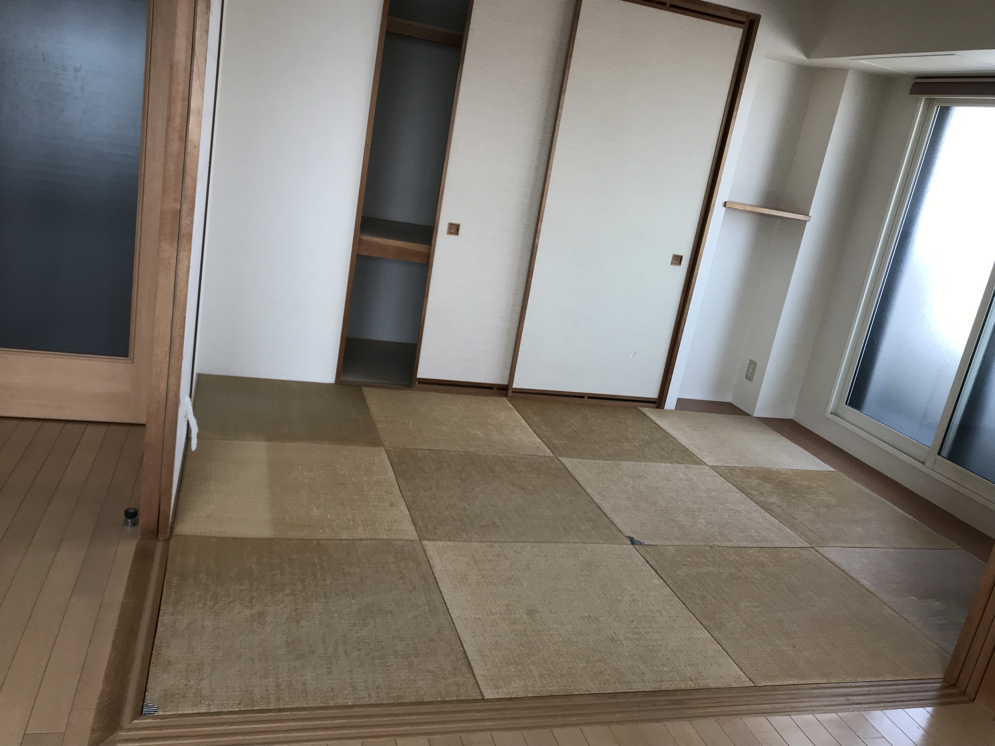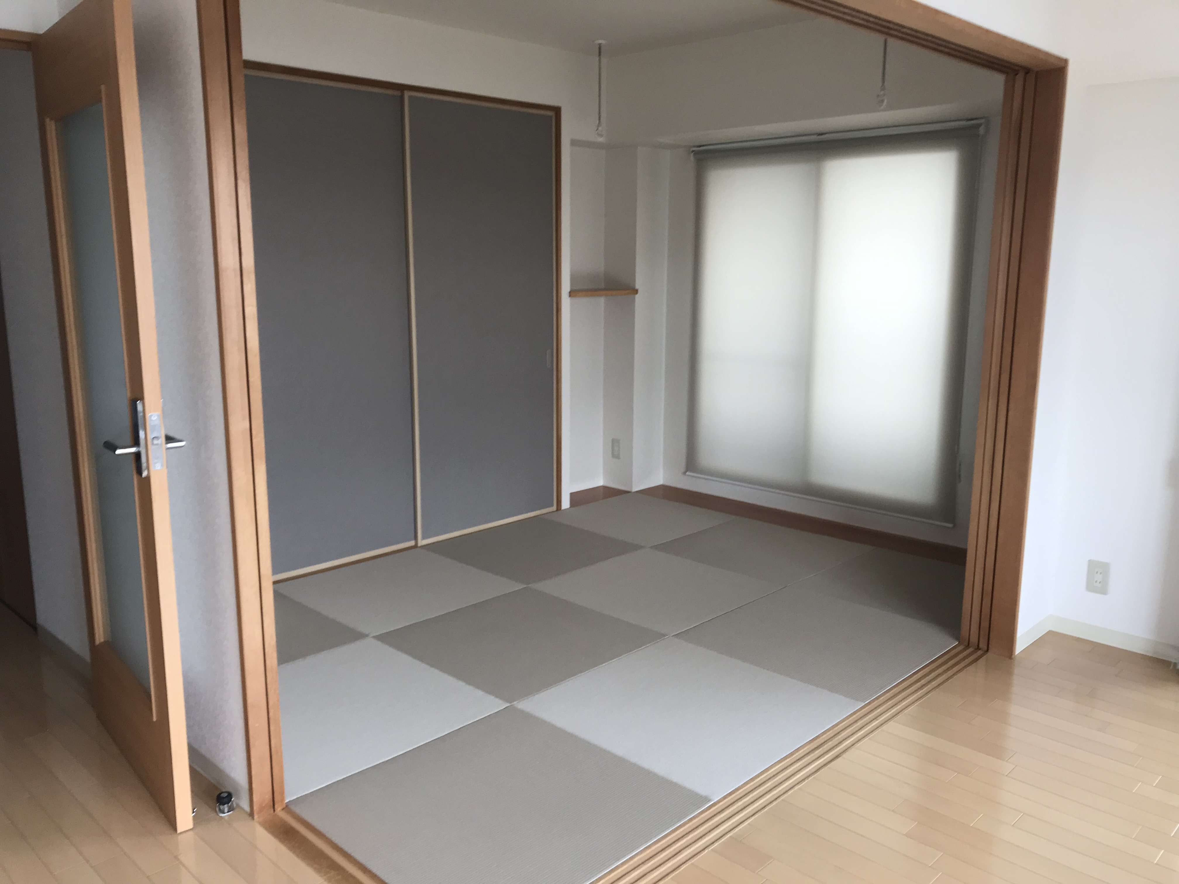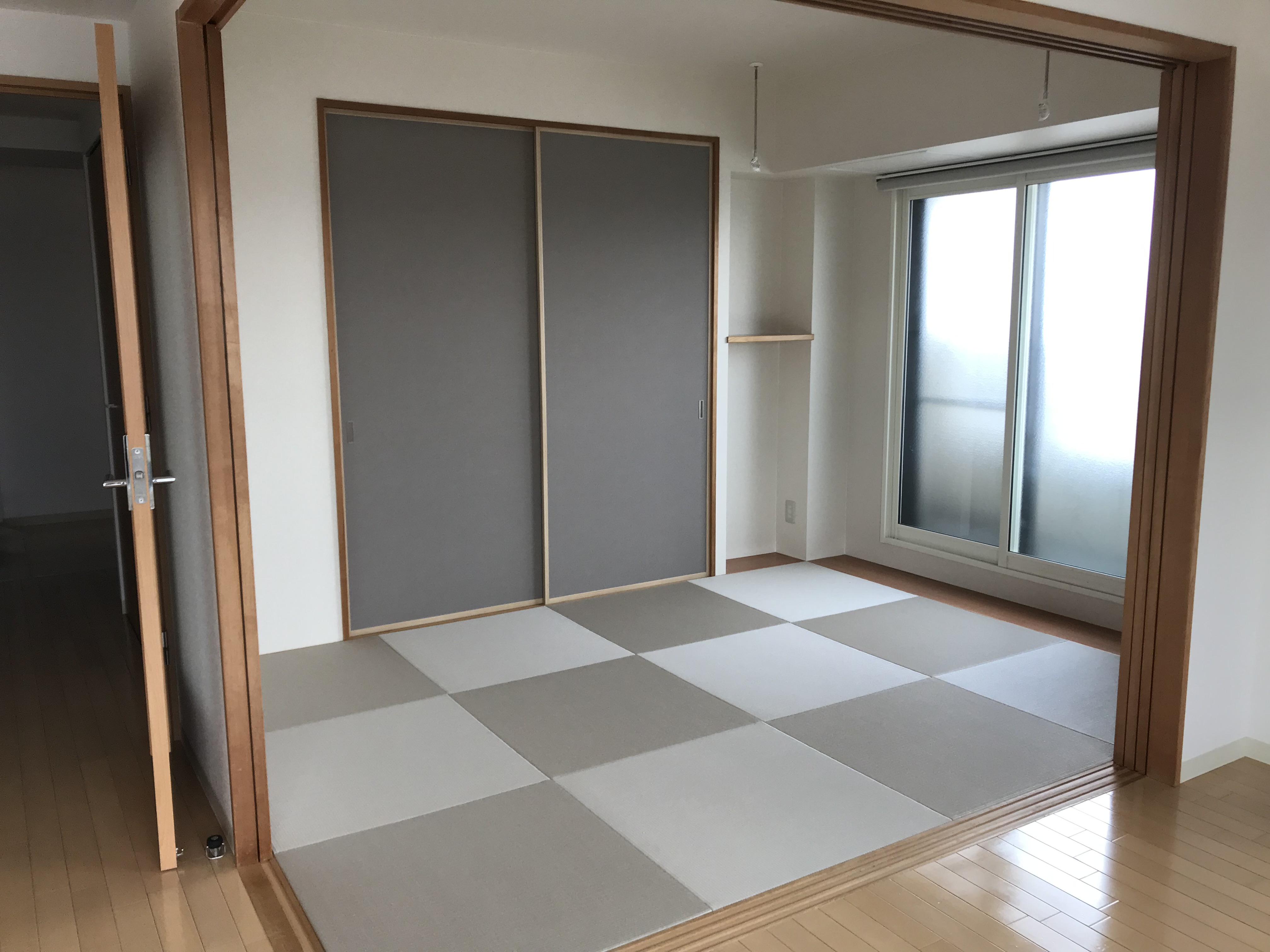 イ草畳をヘリなし琉球畳に替え、襖にアクセントクロスを貼りました。灰桜色という日本古来の色にし落ち着く和室となりました。