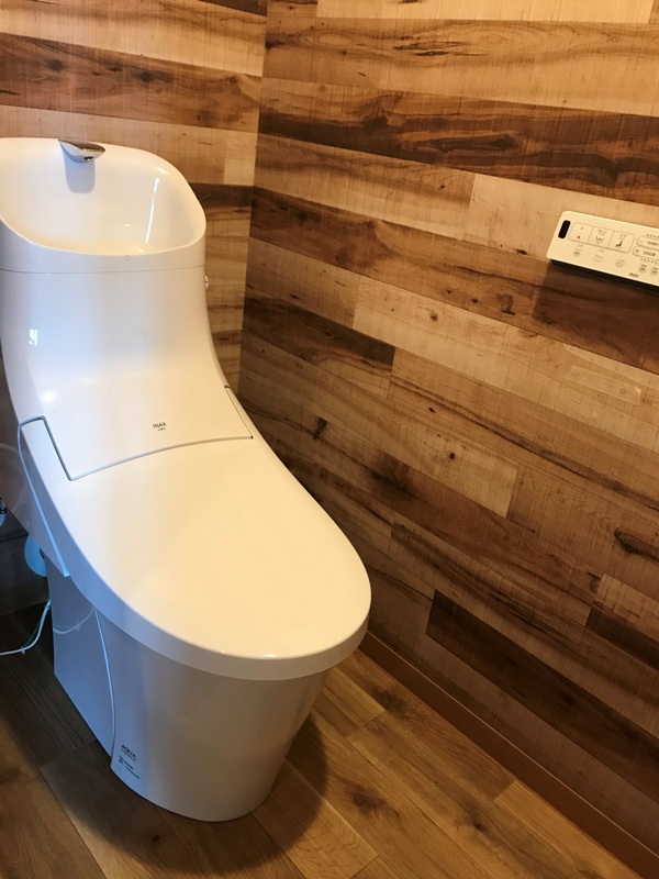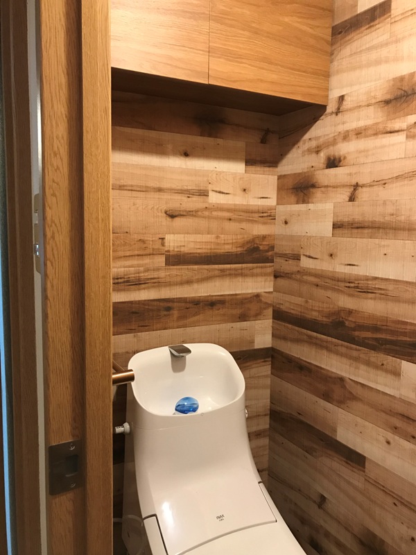 トイレ交換に伴い内装も一新。森林業に長く従事されているお客様のセレクトはオール木目。落ち着いた異空間が出来上がりました。