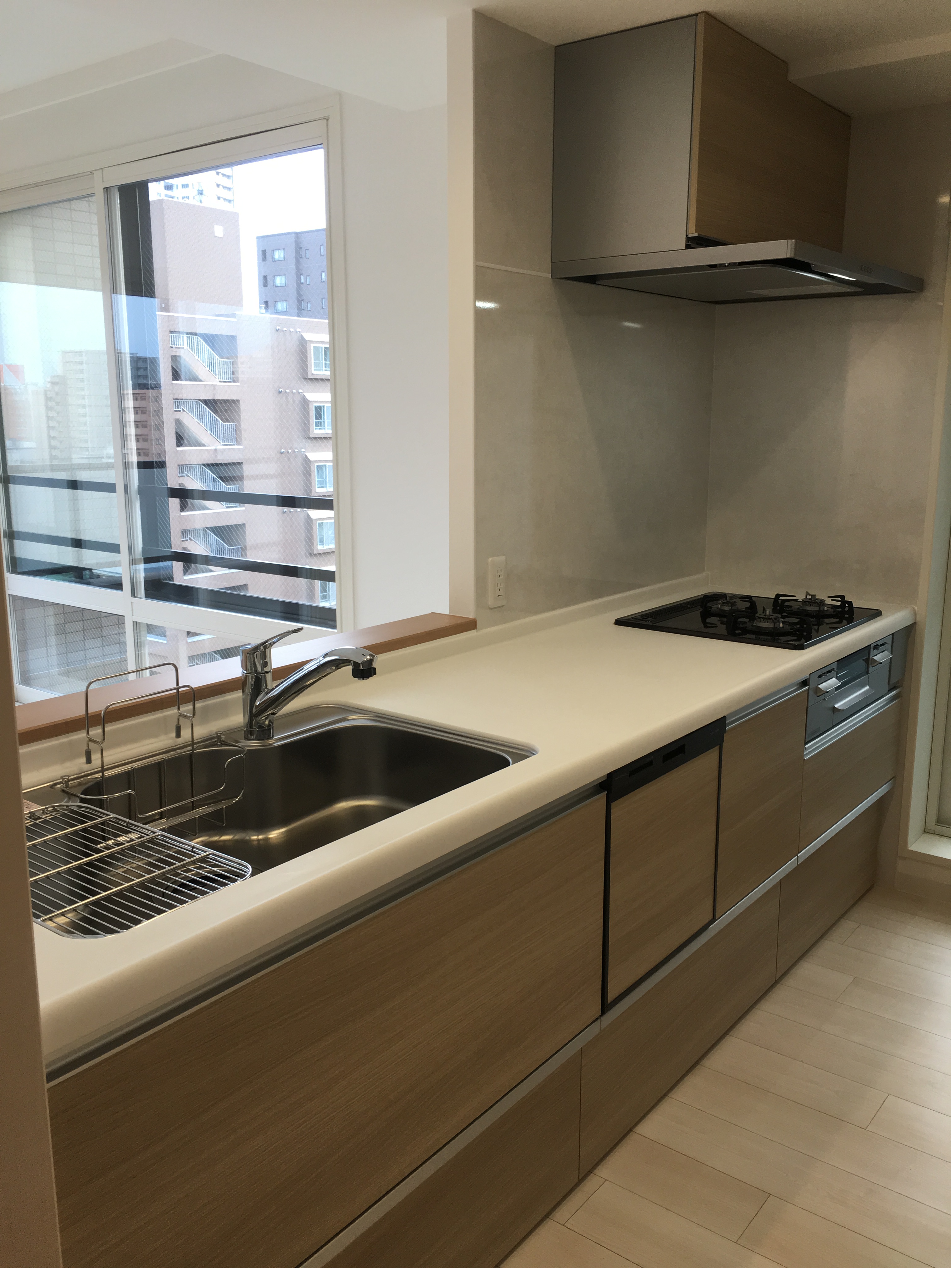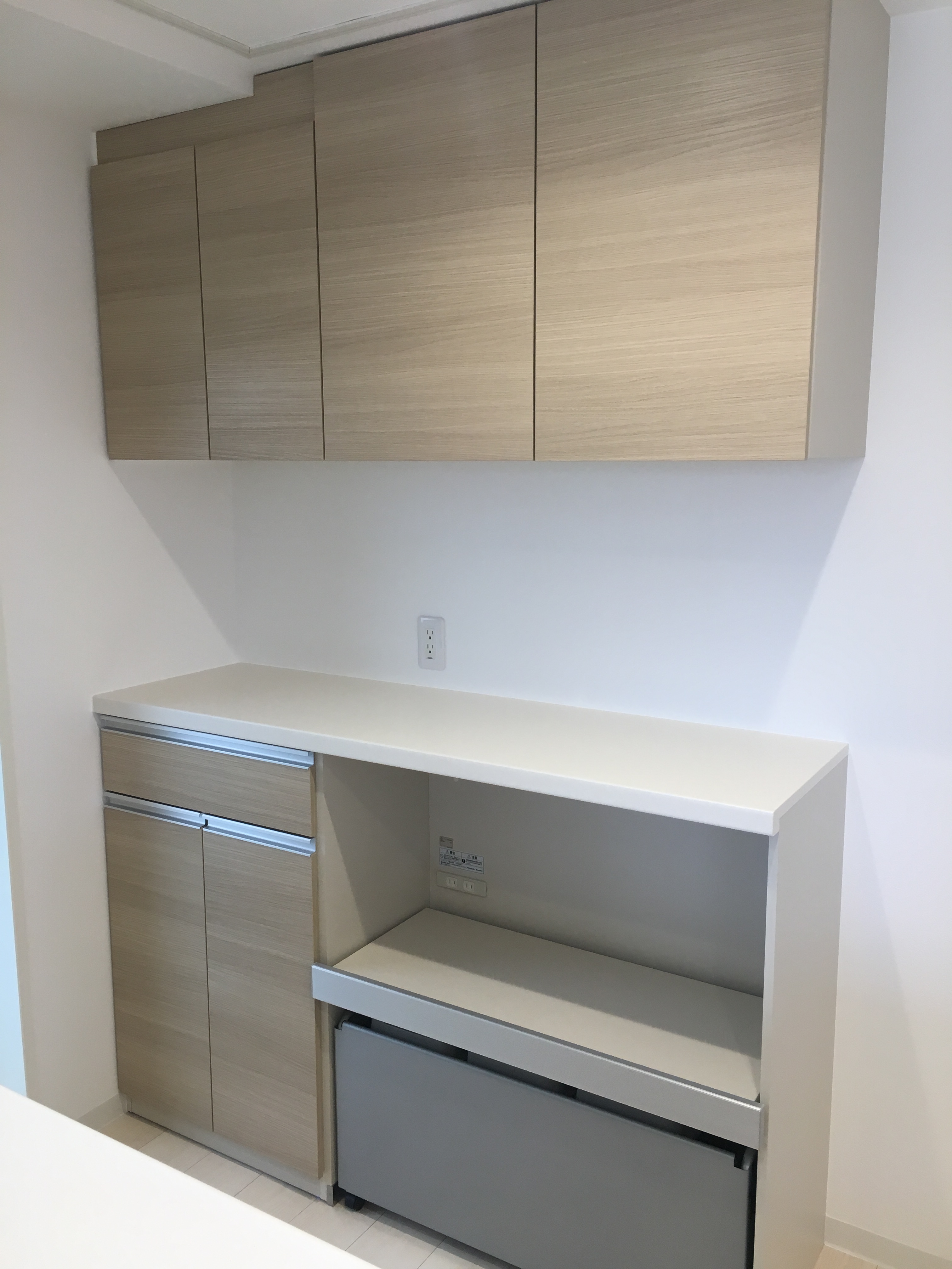 キッチンを交換、キッチンと同じ面材の食器棚を新設しました。キッチンは吊戸をなくし、シンク前の空間を開放的にしました。食器棚は家電収納・ゴミ箱収納付で、限られたキッチン空間を有効的に使える仕様となっております。