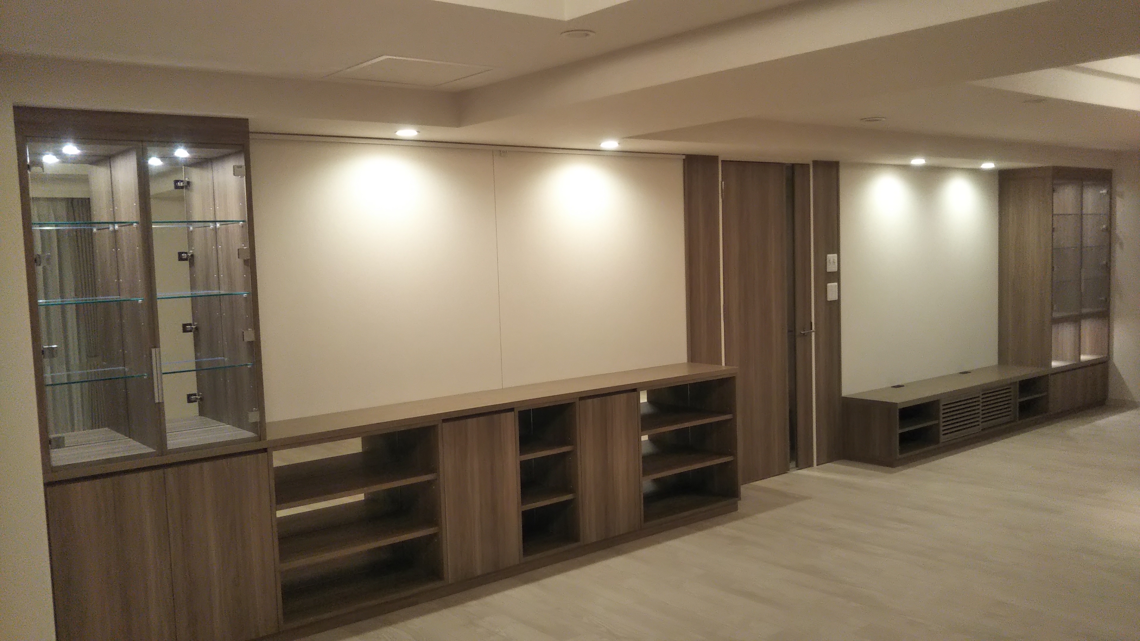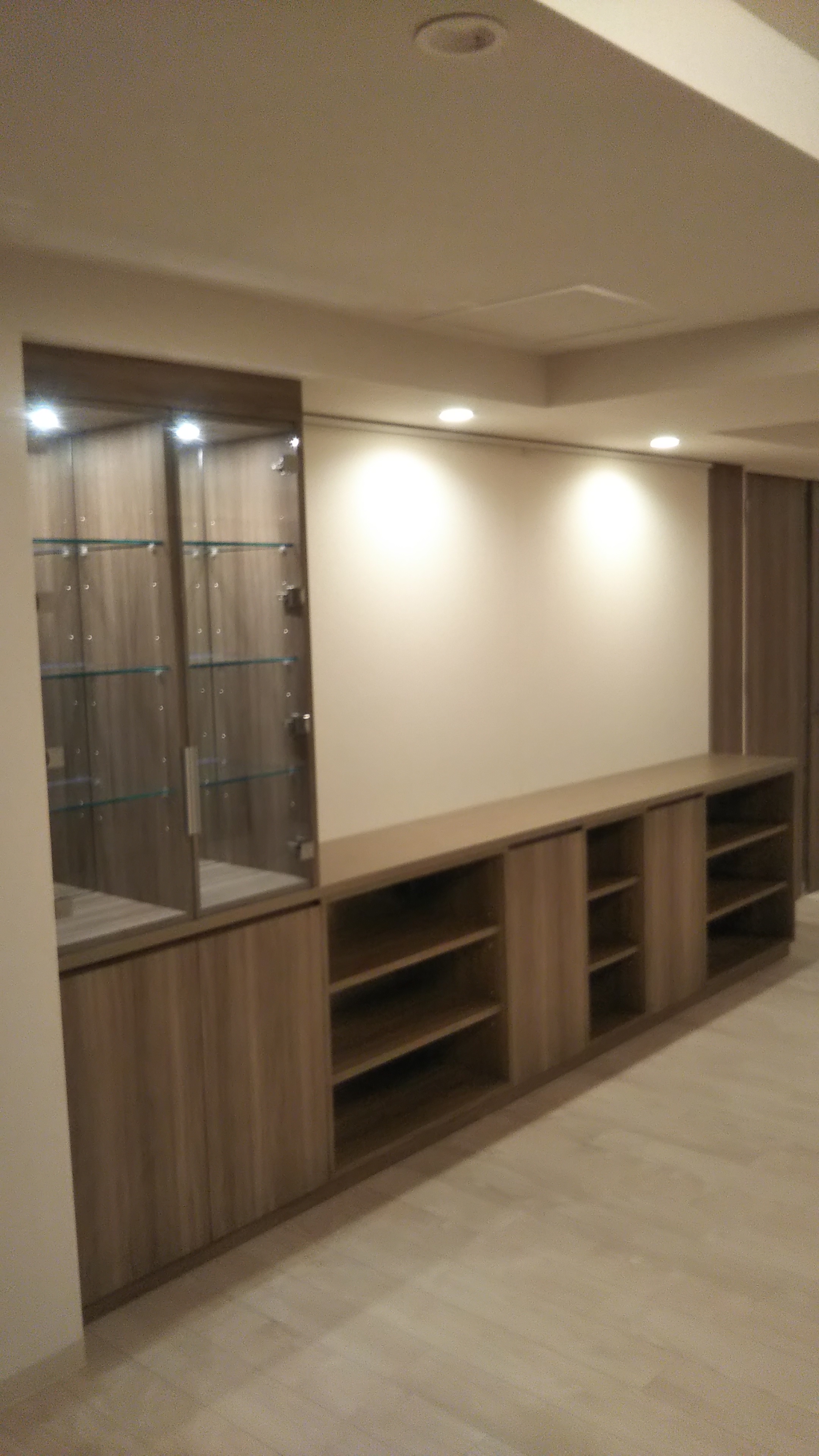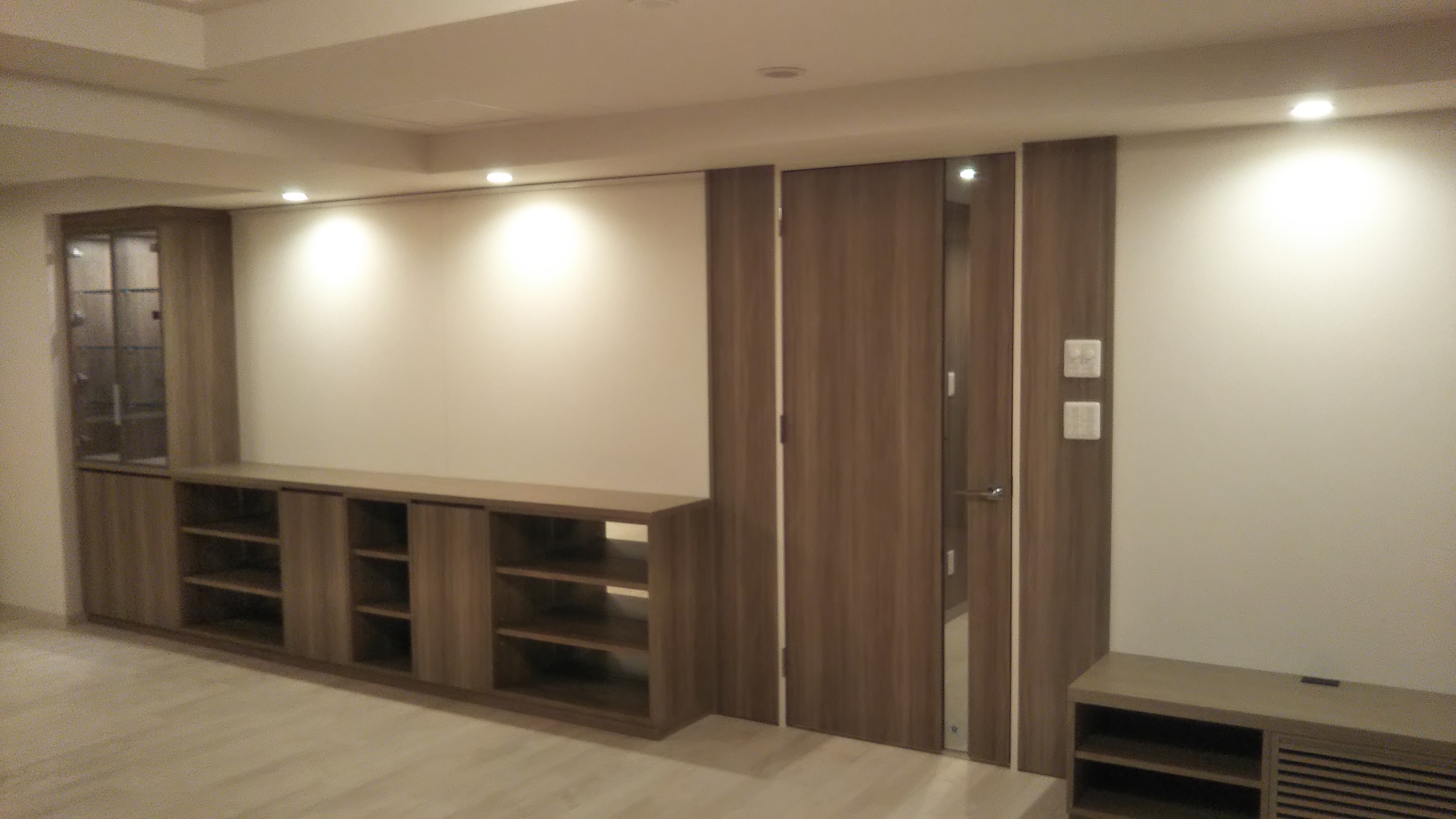 リビング用に飾り棚+TVボード/ダイニング用に飾り棚を各造作にて製作。 扉のサイズが大きく見える様に、建具の両サイドに建具同色の木目パネルを設置。 家具の背面にはミラーを貼り、奥行き感や豪華さの演出を。