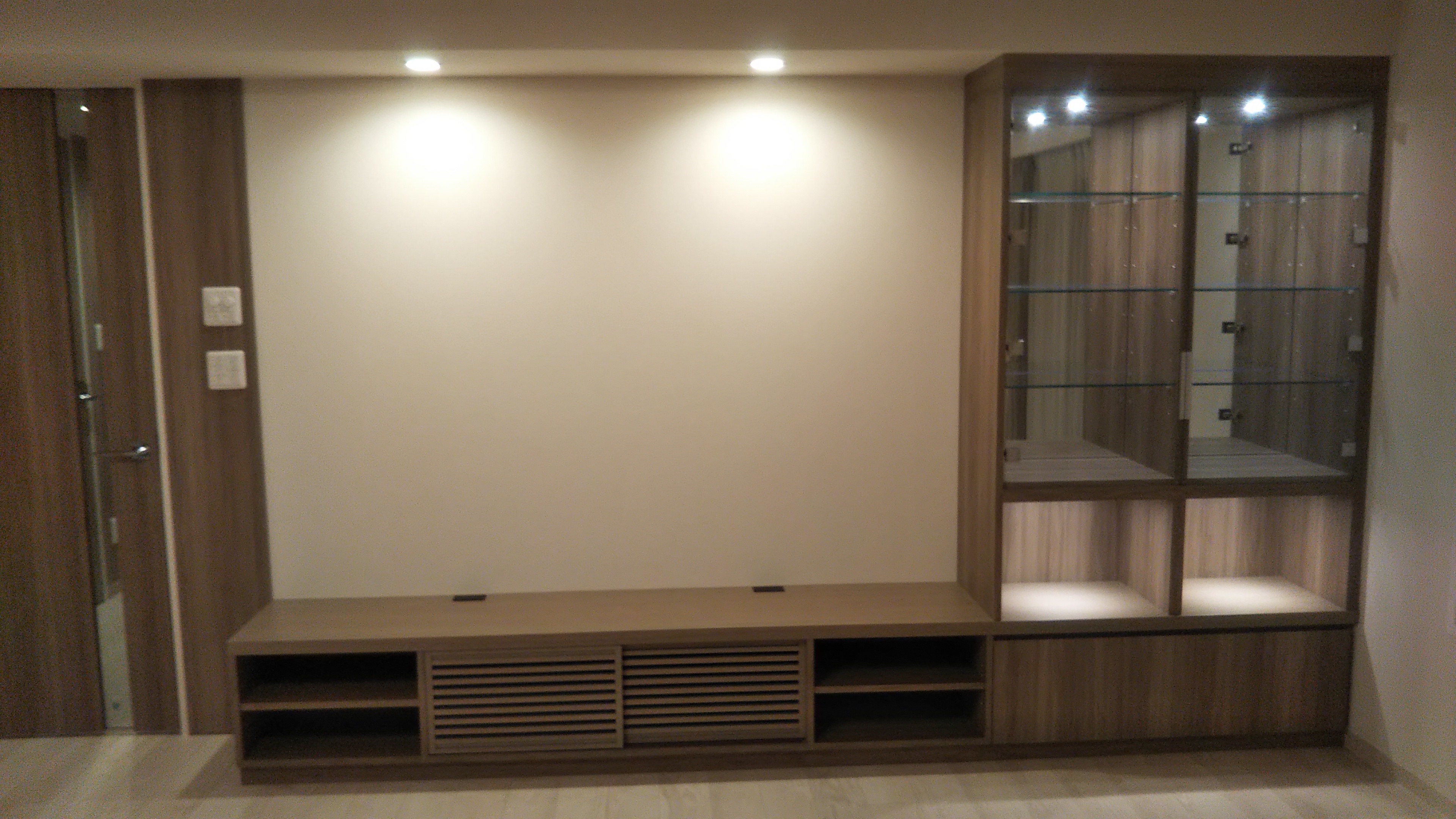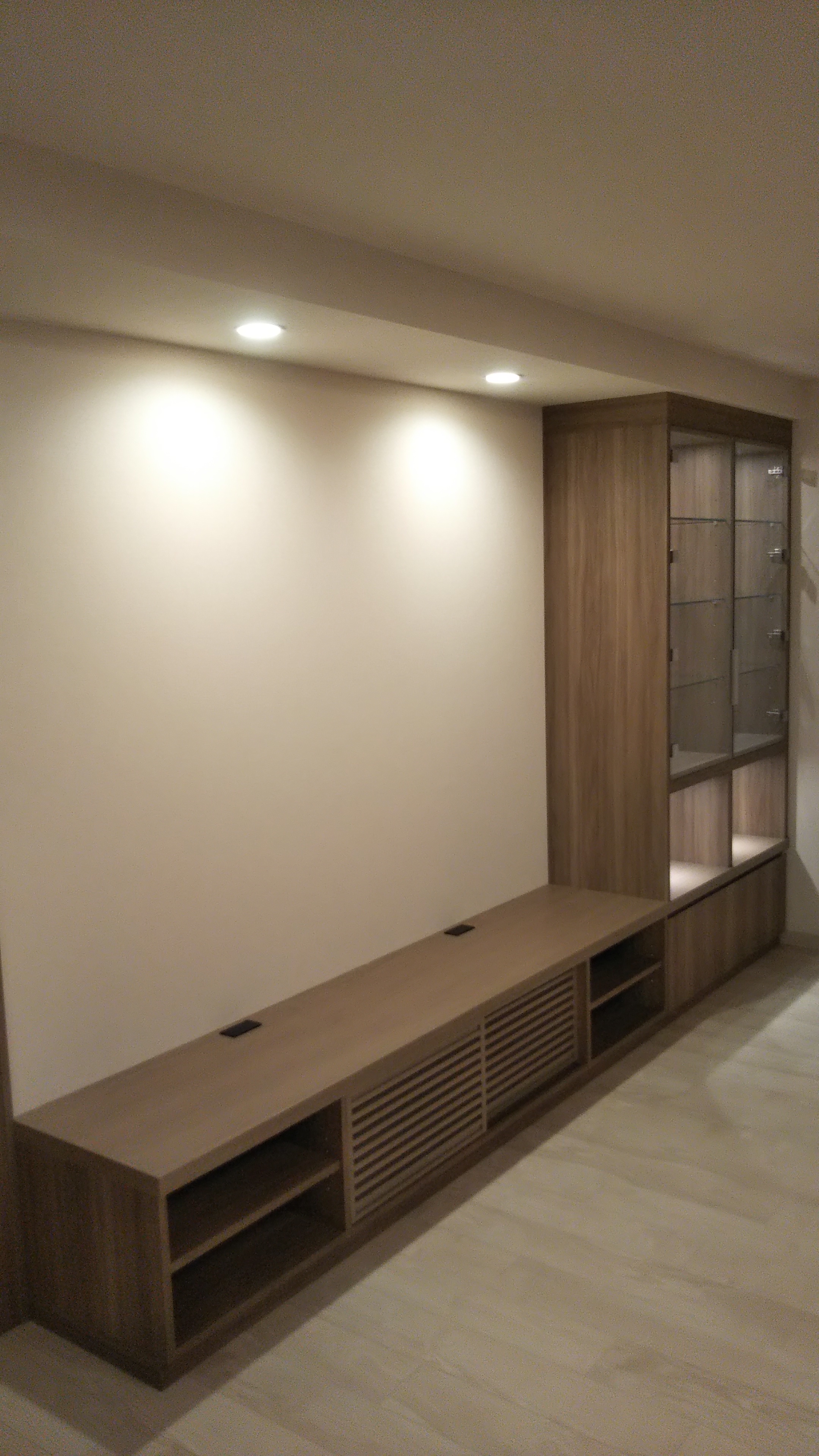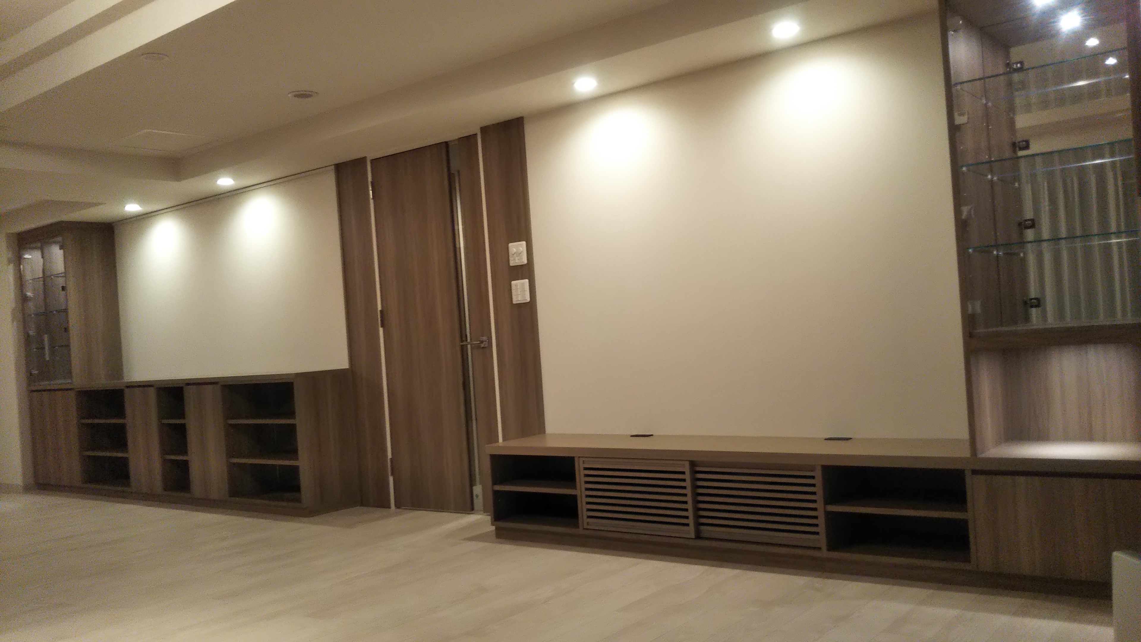 リビング用に飾り棚+TVボード/ダイニング用に飾り棚を各造作にて製作。 扉のサイズが大きく見える様に、建具の両サイドに建具同色の木目パネルを設置。 家具の背面にはミラーを貼り、奥行き感や豪華さの演出を。