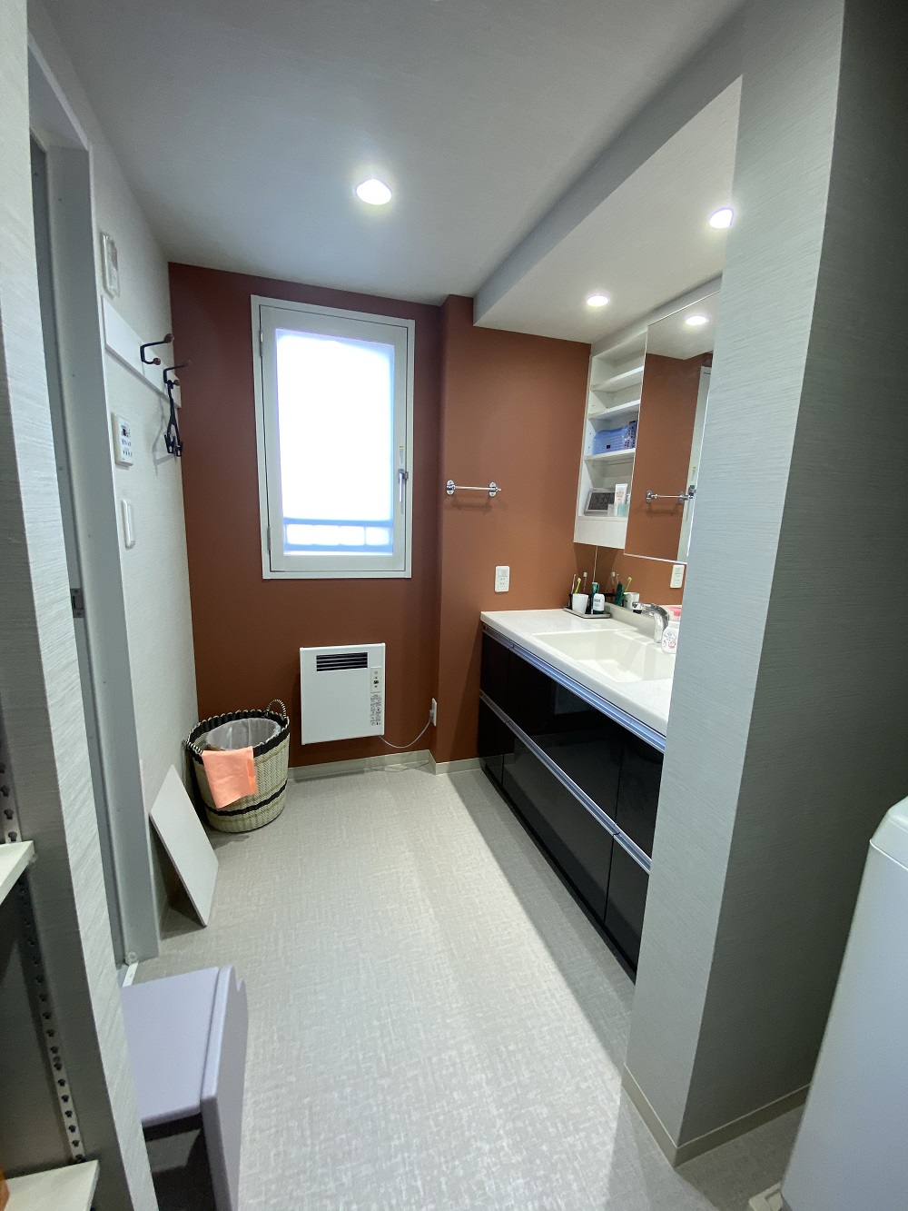 窓下に電気ヒーターを設置しました。壁面に下地を取付る必要があり、クロスの貼替が必要だったため、この機会にアクセントカラーを取り入れました。床は明るいカラーの塩ビシートに貼替え、UTの雰囲気が 大きく変わりました。(09-015 マンションリフォーム)