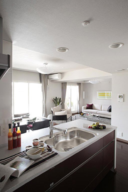 レザーブラウンのキッチン面材を用い、今までにないシックさを演出。質感があるので上質なイメージを与えます。