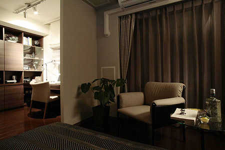 ブラックとホワイトを基調とし、アクセントカラーにエンジ色を加えエレガントな印象に。ダイニングには造作のテレビボードを設置し、サイドに明るさとシャープさを演出する、すりガラス調のミラーを。ワイドなダイニングテーブルを設置し、ゴージャスでゆったりとした空間を演出。カーテンを天井から吊すことで、高さと広さを強調しました。
