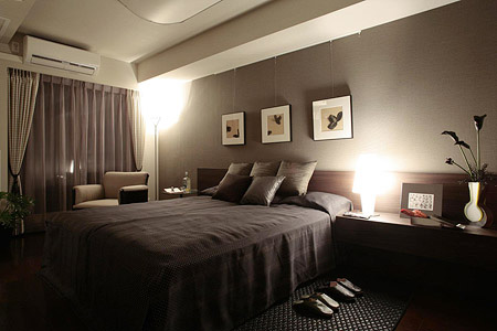 一面の壁のクロスをシックなチャコールグレーに。ベッドヘッドとナイトテーブルを一体化することで、高級感のあるくつろぎの空間を演出ウォールナットの造作と相性の良い光沢のあるファブリックを用い素材感をアピール。