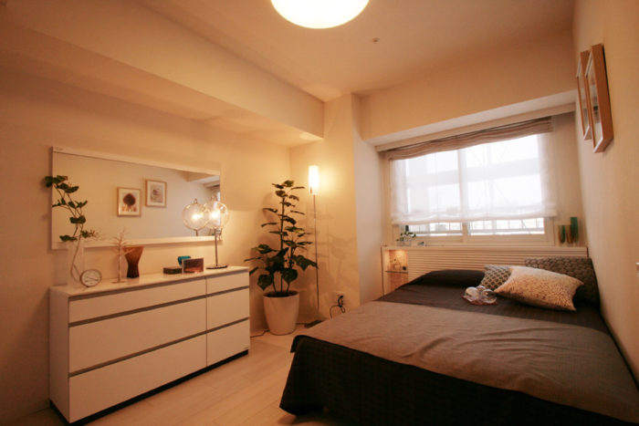 明るいカラースキームの中に、シックな色合いのベッドリネンを使うことで落ち着 きのある大人のベッドルームを提案しています。