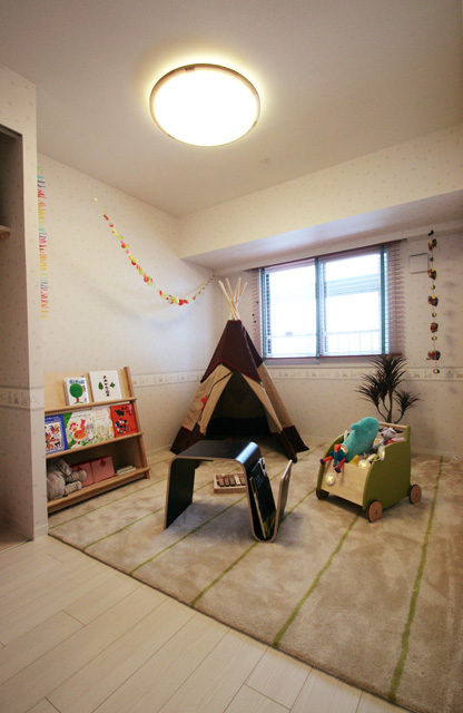 ドアをなくすことでリビングとのつながりを感じながらも子供が自分のスペースと してのびのび楽しく遊べるキッズスペースとして提案しています。 テントや葉っぱモチーフのカートや、落書きの出来るテーブルなど、遊び心をちりば めたキッズスペースとなっています。