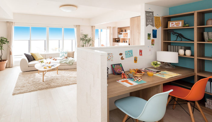 TVの背面にはスタディコーナーを設け、造作のデスクと書棚を設置。キッチンから目が届く位置で子供たちが勉強できるスペースになっています。アクセントに配置したイームズチェアが楽しげな雰囲気を醸し出します。