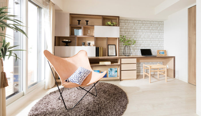 リビング横の洋室には使う程に体になじみ、深みを増す革の風合いを楽しめる逸品「BKFチェア」、別名「バタフライチェア」を配置。造作家具はナチュラル色とウォルナット色のツートンカラーとすることでメリハリをつけ、ランダムな棚板の配置と鏡面の扉面材を使用することで遊び心のあるデザインとしました。