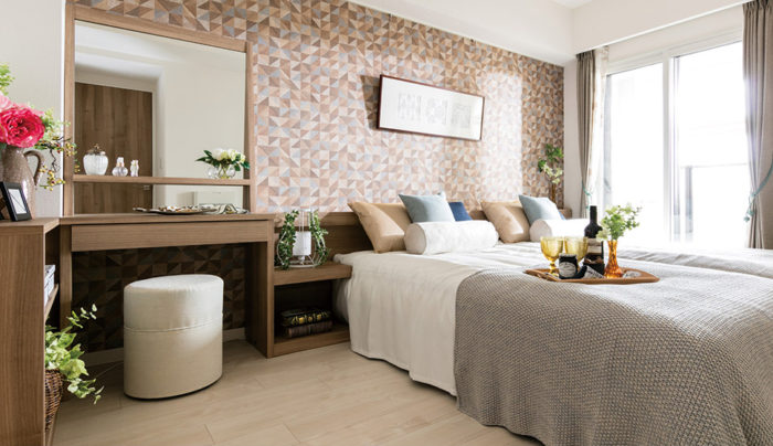主寝室は木質感漂う柔らかな空気感を表現しました。アイボリーをベースに、淡いトーンのクッションと素材感のあるグレーのスローを合わせ、リラックス感のある空間になっています。