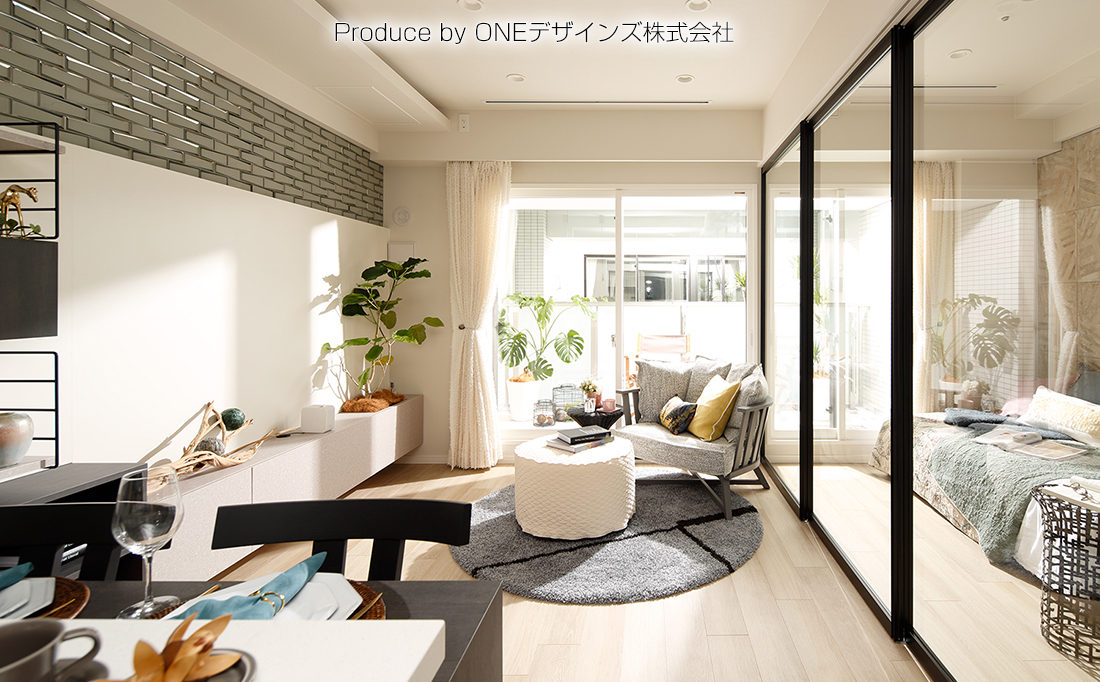 空間はシンプルに、大きなガラス引き戸を使用し閉塞感の無いスペースを演出。壁面は、照明と植栽で柔らかい雰囲気に。 印象的なお気に入りの1人掛けチェアとスツールを配置。