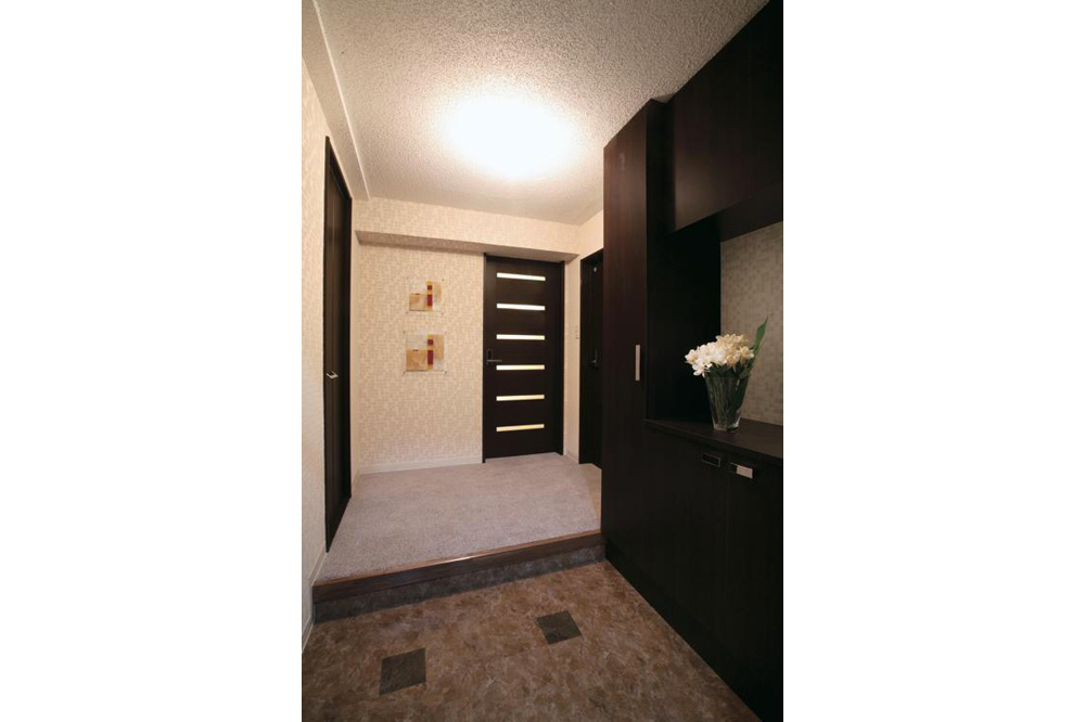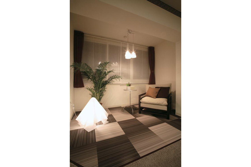 フロアには、自然が創った健康で安心なウールカーペットを使用。 壁には調湿やカビ・ダニの繁殖抑制、消臭効果(ペット・タバコなど)のあるセラミックタイルを貼り快適な空間を実現。カラーはブラウン・グレー・ホワイトをベースとし、あたたかく落ち着いたイメージに仕上げました。