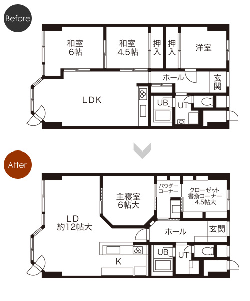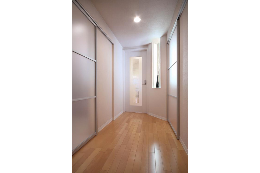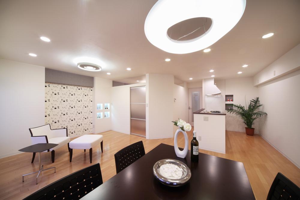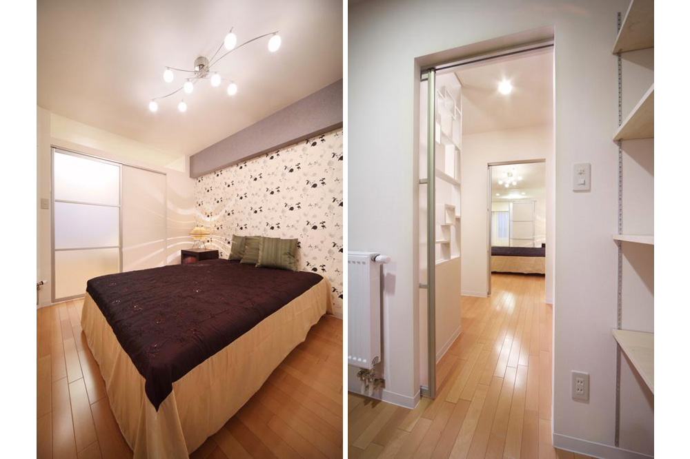 狭く暗い印象だった3LDKを2LDKに変更し、広々としたオープンスペースに。大型納戸、子 供部屋、書斎として多目的に活用できるマルチパーパスルームを設け、ライフスタイルに 合わせて自由自在に使える。