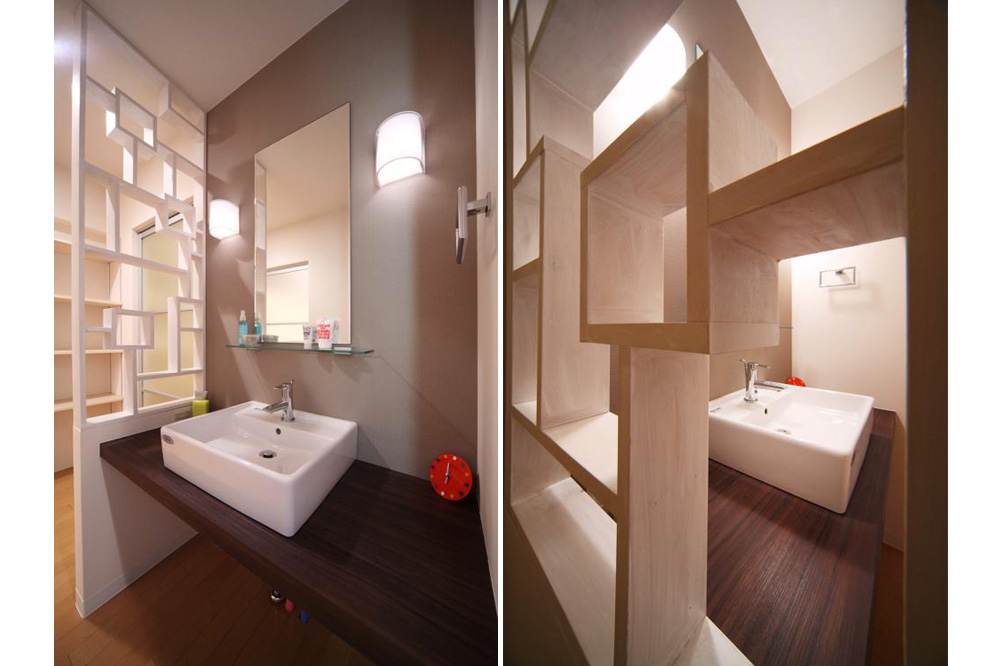 また、狭く、使い勝手の悪いユーティリティから、洗面台をパウダールームとして独立。朝の支度がスムーズに流れるように、ベッドルーム→パウダールーム→マルチパーパススペースという動線を確保しました。