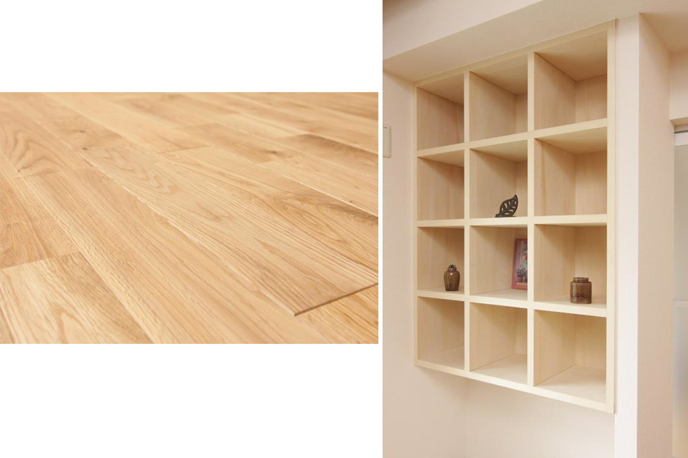 お庭の自然との関わりを感じさせる、ナラ材の無垢フローリングを使用。