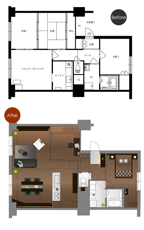 細かく仕切られた間仕切りを撤去し、開放感のあるリビングダイニングと書斎、寝室の2LDKへ。