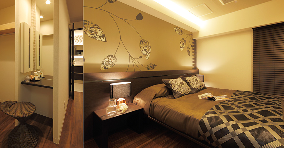 ウォークインクローゼットへの入口にはパウダーコーナーも設置。ユーティリティへの入口も設け、この一部屋で身支度が完結できるように動線にも配慮しました。