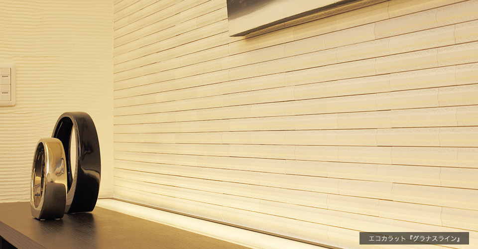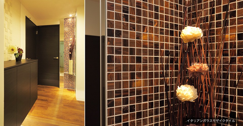 玄関収納の上には空気をトリートメントしてくれる調湿・消臭タイル『エコカラット』2種類をデザイン貼りしています。
