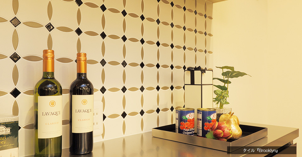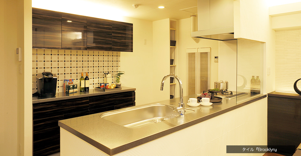 食器棚の背面壁には多種多様な民族、人種が集い、特異な文化・芸術を生みだすNY・Brooklynにインスピレーションを得た聖和セラミックス社のフュージョンタイル、『Brooklyn』を日本で初めて採用、シックな中に斬新さをプラスするアクセントになっています。