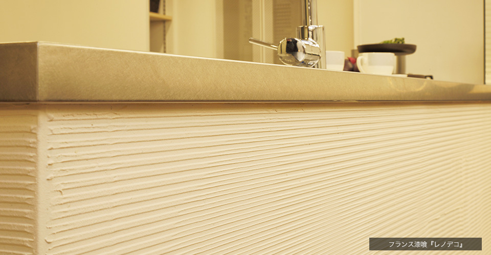 キッチンの腰壁はフランス漆喰『レノデコ』の櫛引き仕上、ダイニングボード上に貼ったエコカラットと横ラインをつなげることで空間に広がりを与えています。