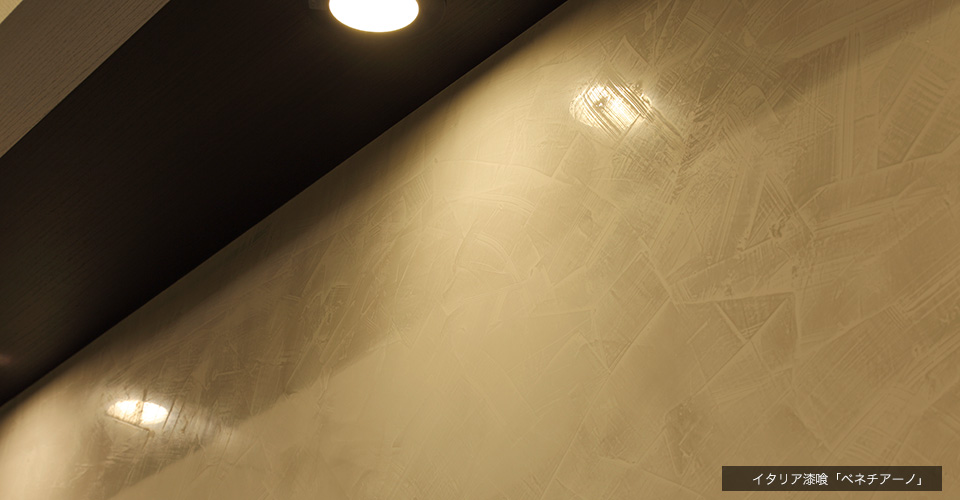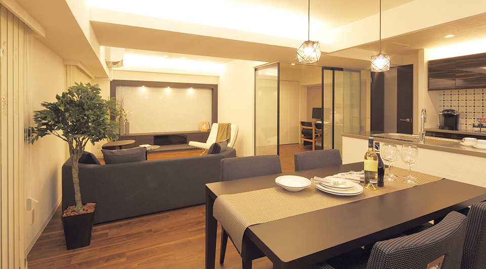 間接照明に照らし出されるTVボード背面のイタリア漆喰「ベネチアーノ」とガラスやミラーから生まれる光がシックな空間に華やかなアクセントを添えています。