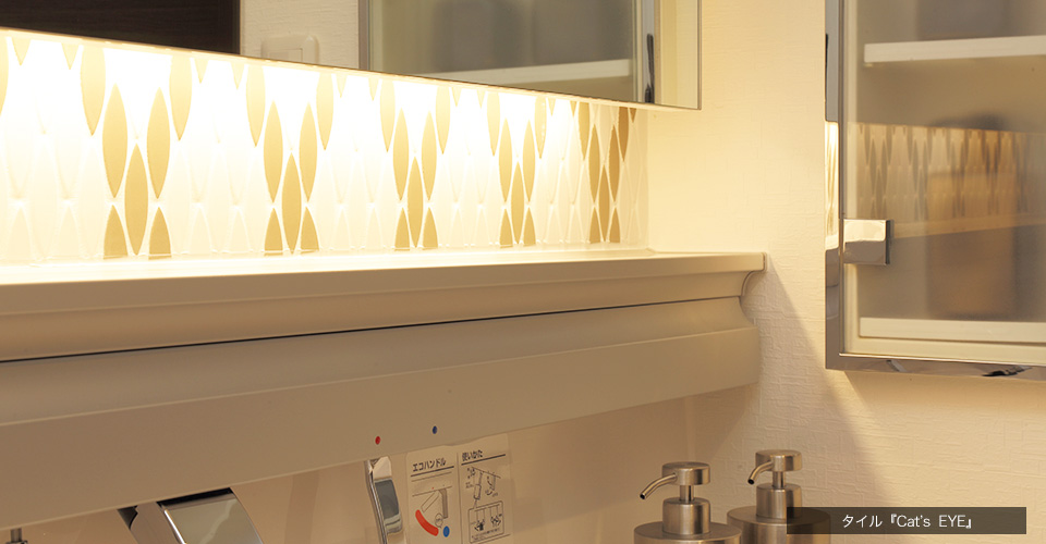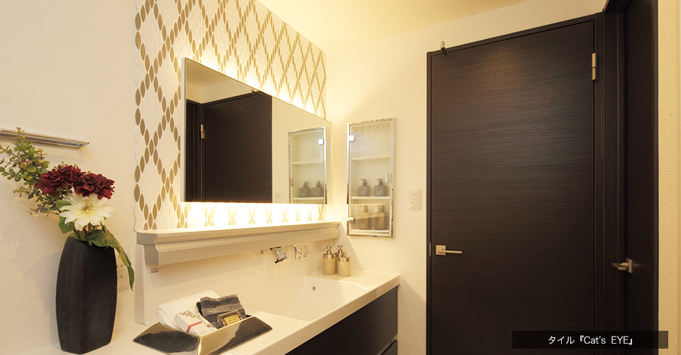 ミラーの背面には形が特徴的な聖和セラミック社のタイル、『Cat’s EYE』をミックス貼りにし、印象的な空間に仕上げています。