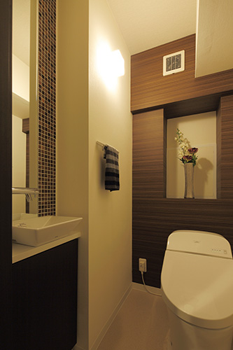 手洗いカウンター部分に貼ったタイルと色味を統一することで落ち着きある空間としました。