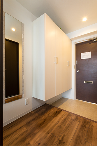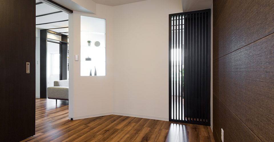 メーカー品の建具と造作家具の色を統一しているので、全体的にまとまりのある落ち着いた雰囲気に仕上がっています。