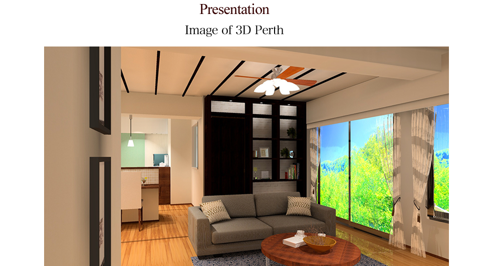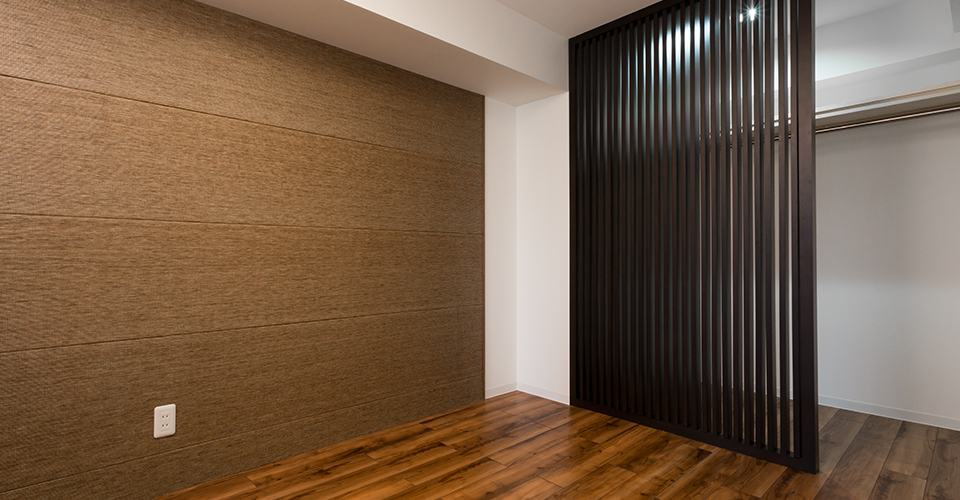職人によって組み上げられた木製の作りつけ家具をフォーカルポイントに、寝室との間仕切り壁の一部に使用した格子壁や天井に通した見切り材がリゾートテイストを演出しています。