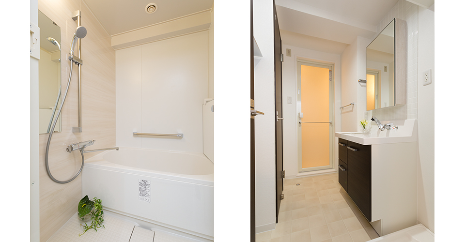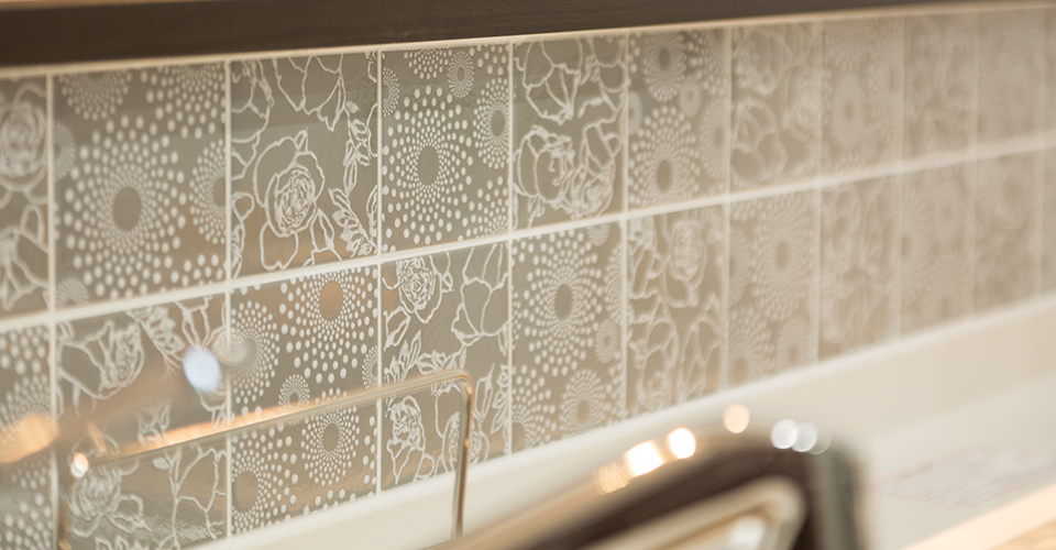 洗面化粧台周りのタイルは清潔感のあるものを選択。