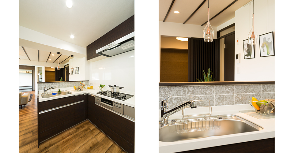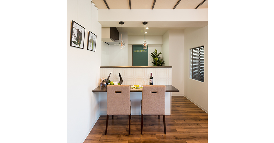 スペースを最大限有効活用したL型のオープンキッチンに、軽食ができるようなカウンターを隣接。 キッチン天板上のタイルが楽し気な雰囲気。背面の黒板クロスもアクセントとして一役買っています。 暗くならない様、洋室との境には明り取り用の小窓を設けました。