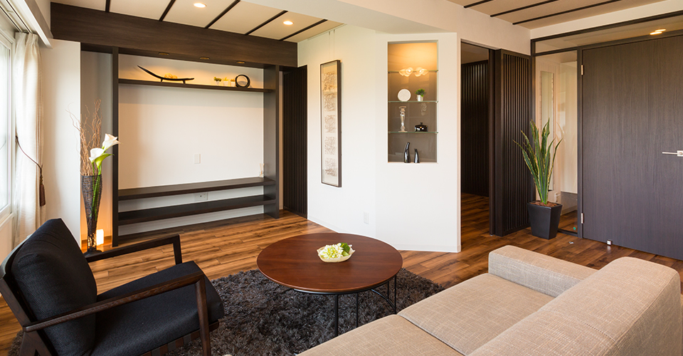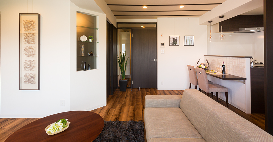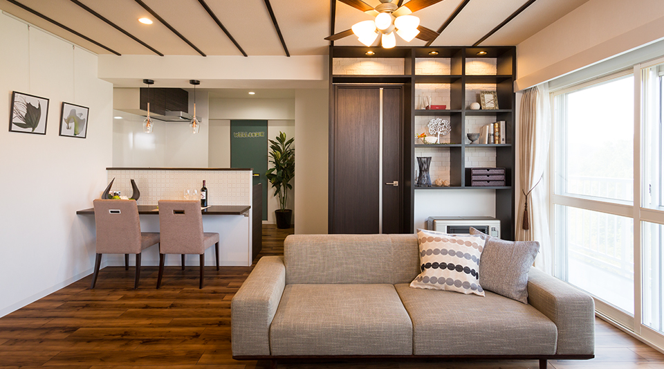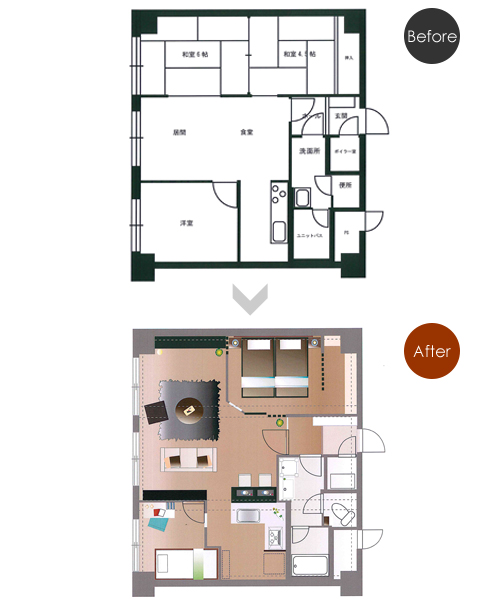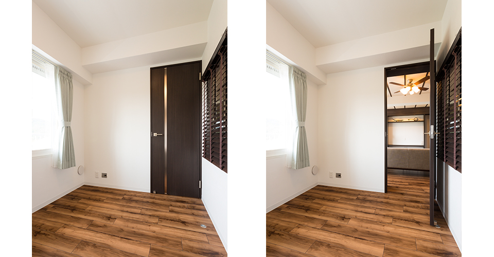 細かく仕切られた間仕切りを撤去し、解放感のあるLDKと寝室、洋室の2LDKへ。