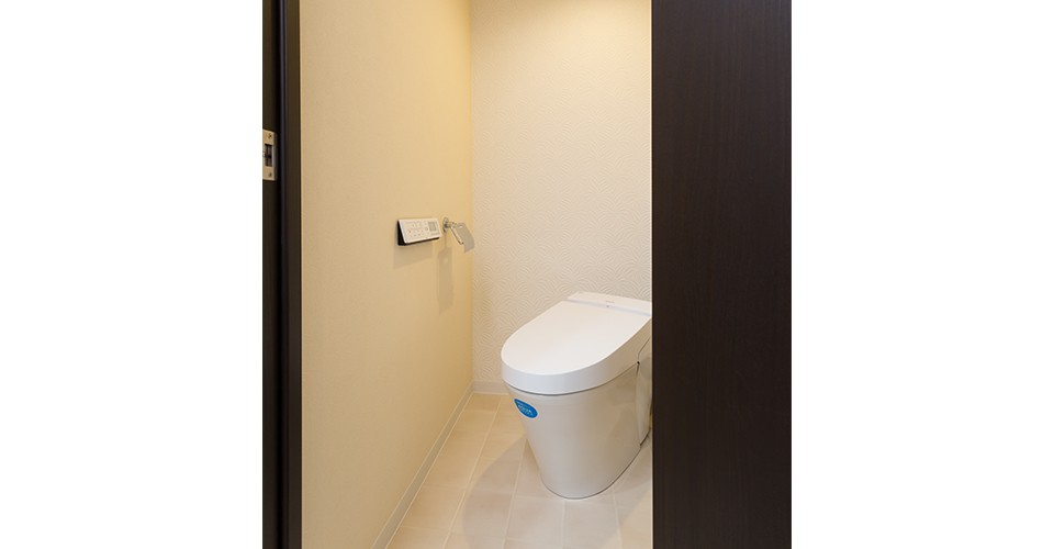 トイレも壁の位置をずらし、トイレ本体を斜めに配置することにより必要寸法を確保しました。